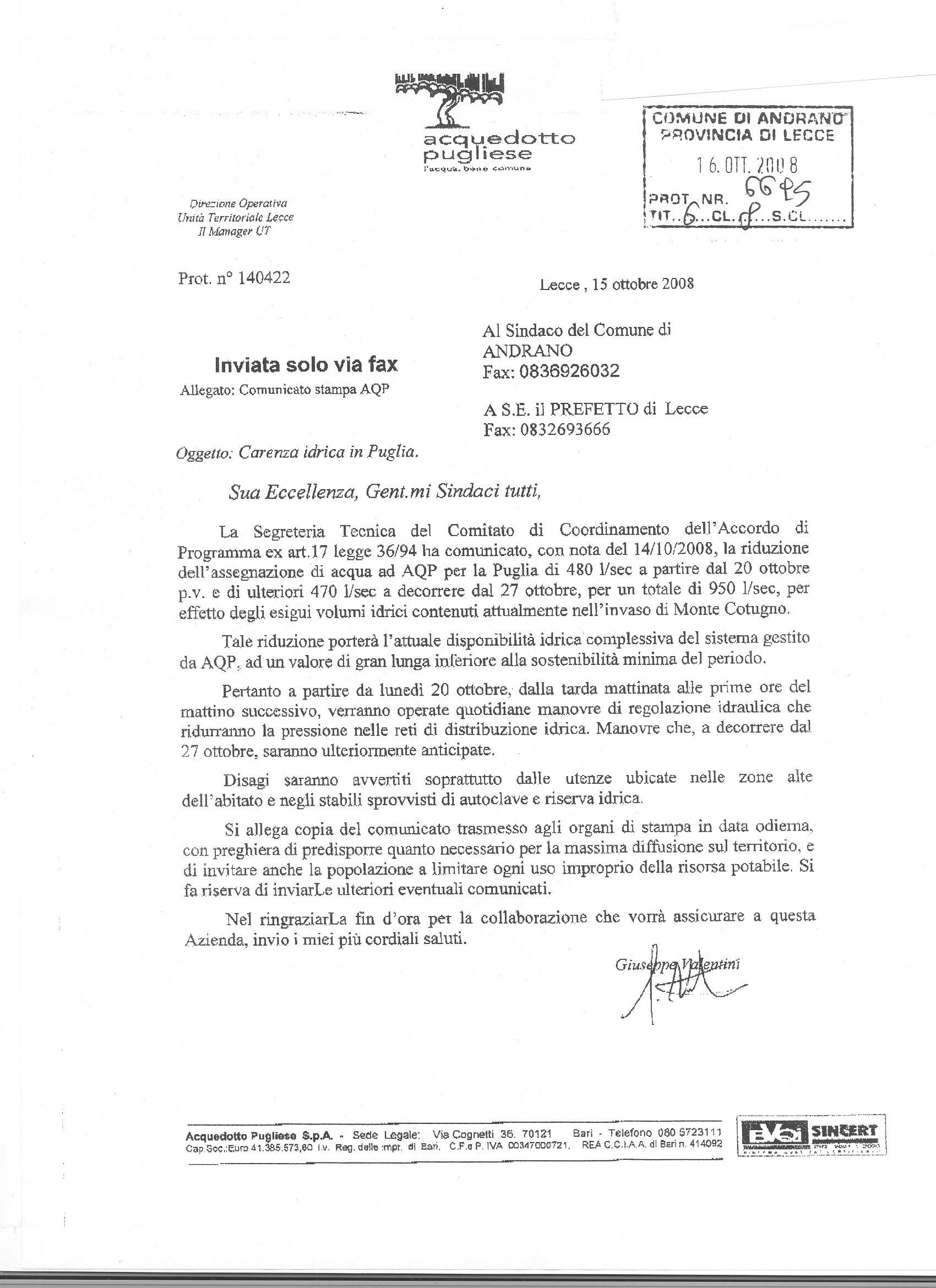 "'a partire da LunedÌ 20 Ottobre, dalla tarda mattinata alle prime ore del mattino successivo, verranno operate quotidiane manovre di regolazione idraulica che ridurranno la pressione nelle reti di distribuzione idrica. Manovre che, a decorrere dal 27 Ottobre, saranno ulteriormente anticipate."'