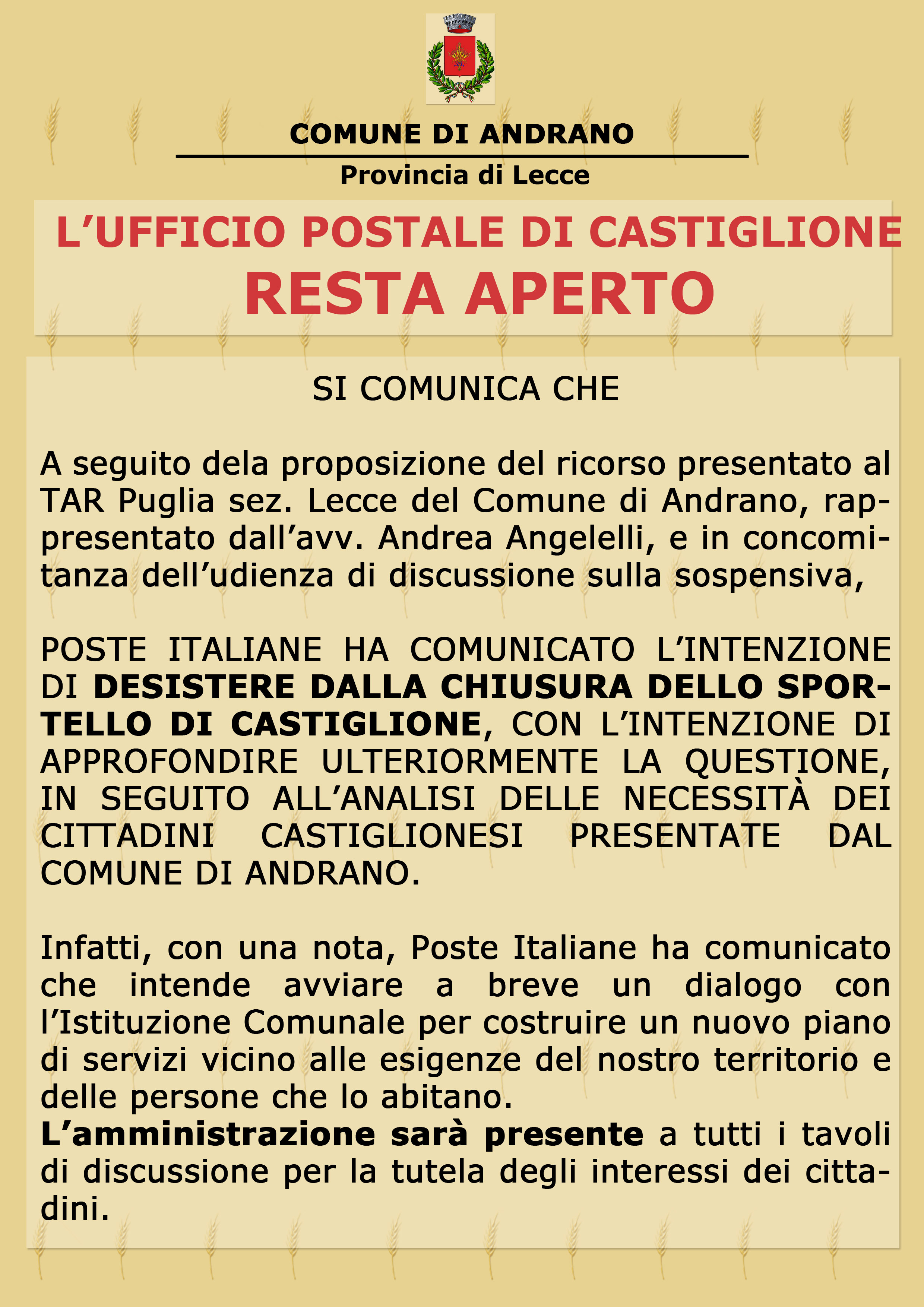L'UFFICIO POSTALE DI CASTIGLIONE RESTA APERTO