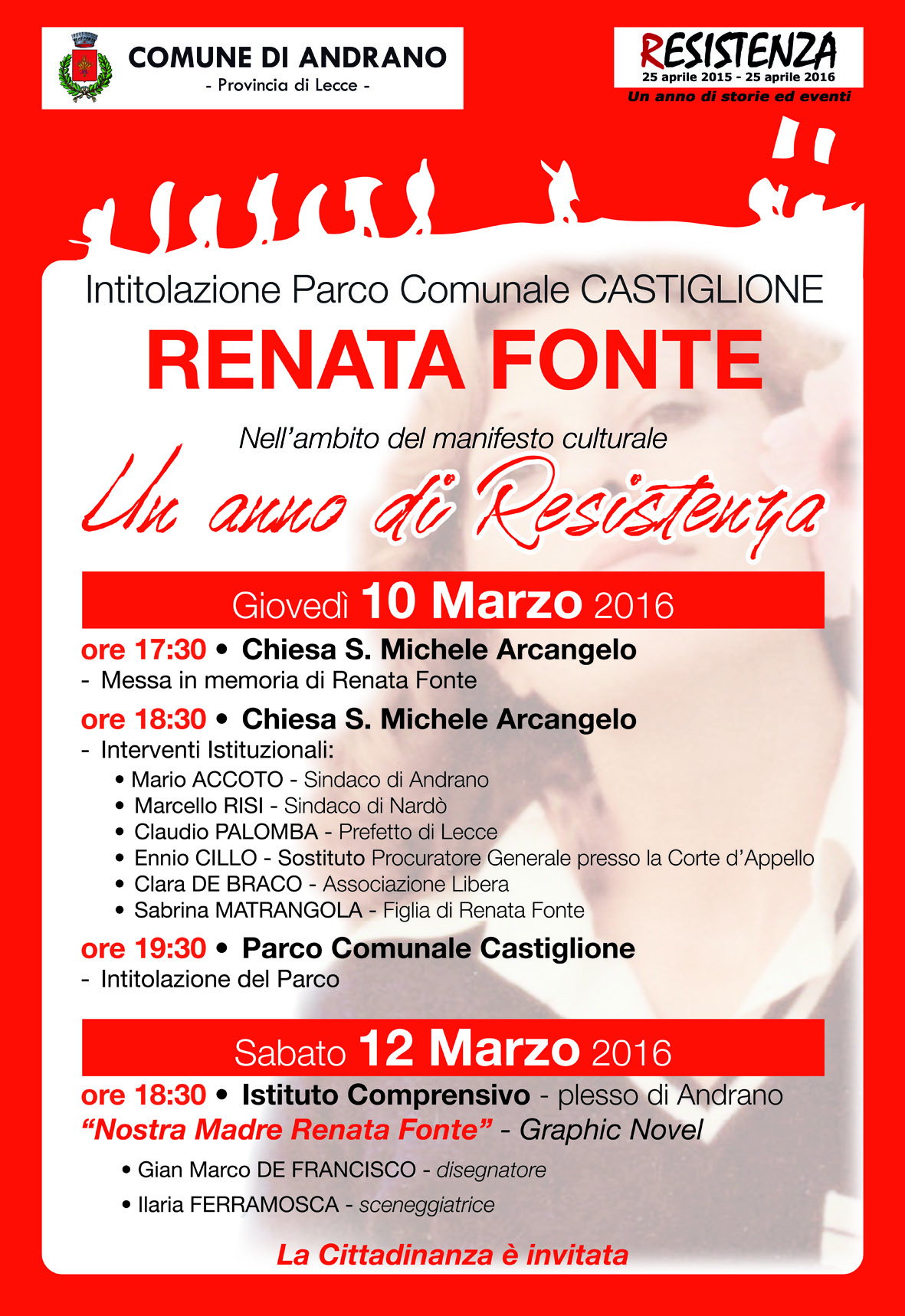 10 marzo: Intitolazione del Parco Comunale a Renata Fonte 12 marzo: presentazione del fumetto "Nostra Madre Renata Fonte" ai ragazzi dell'istituto comprensivo, Plesso di Andrano