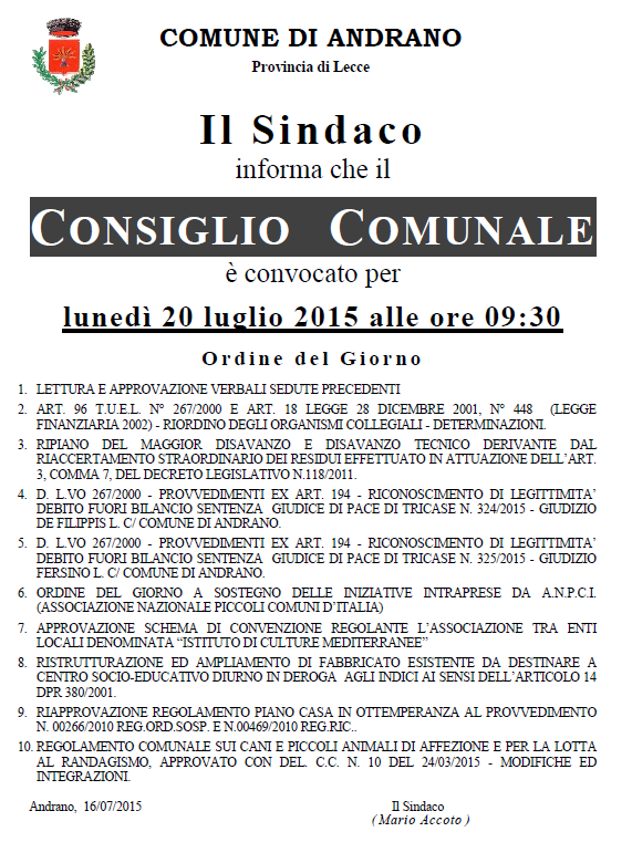 CONVOCAZIONE CONSIGLIO COMUNALE