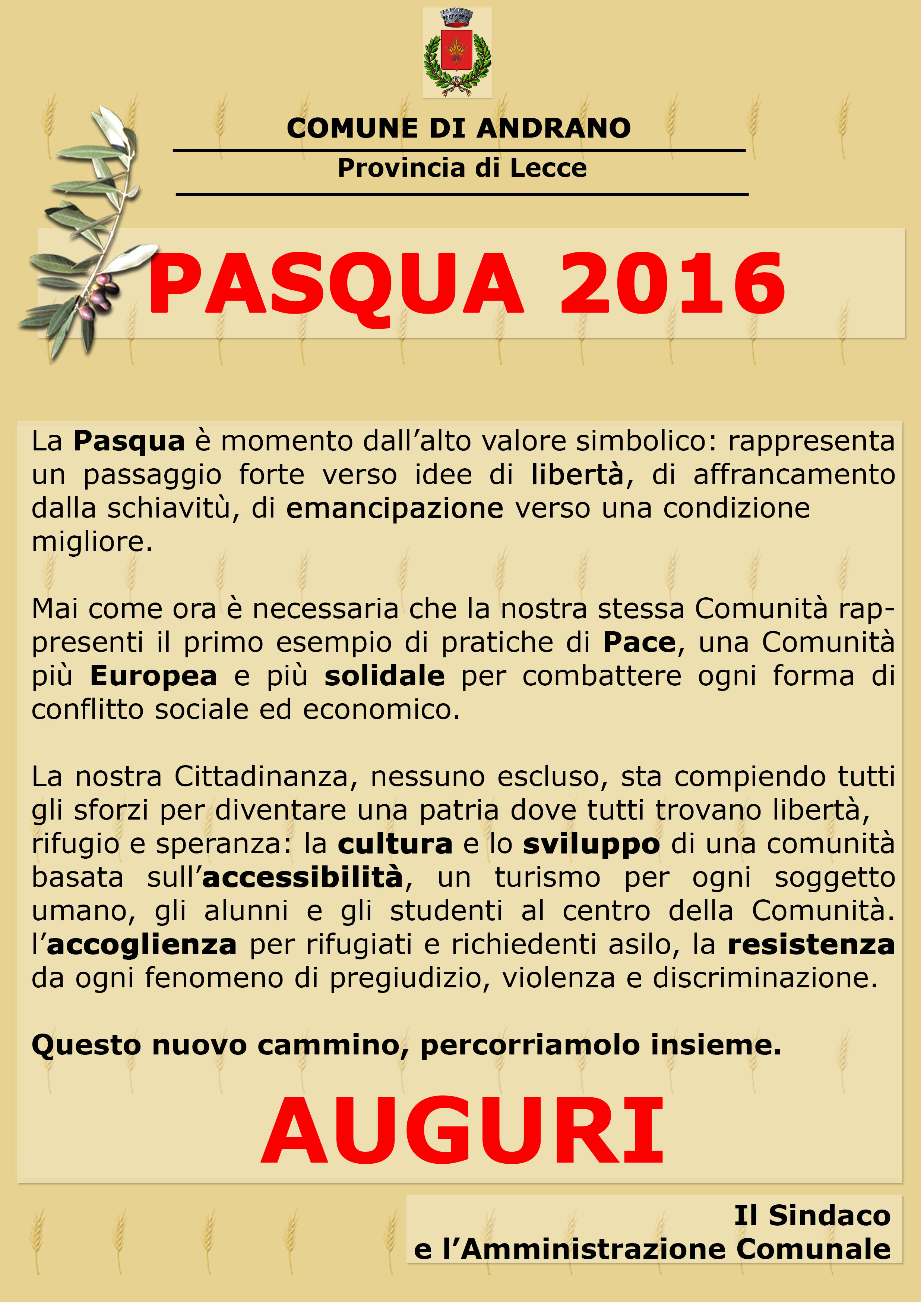 Il Sindaco e l'Amministrazione Comunale augurano una Pasqua di Pace, Libertà , Solidarietà e Accoglienza