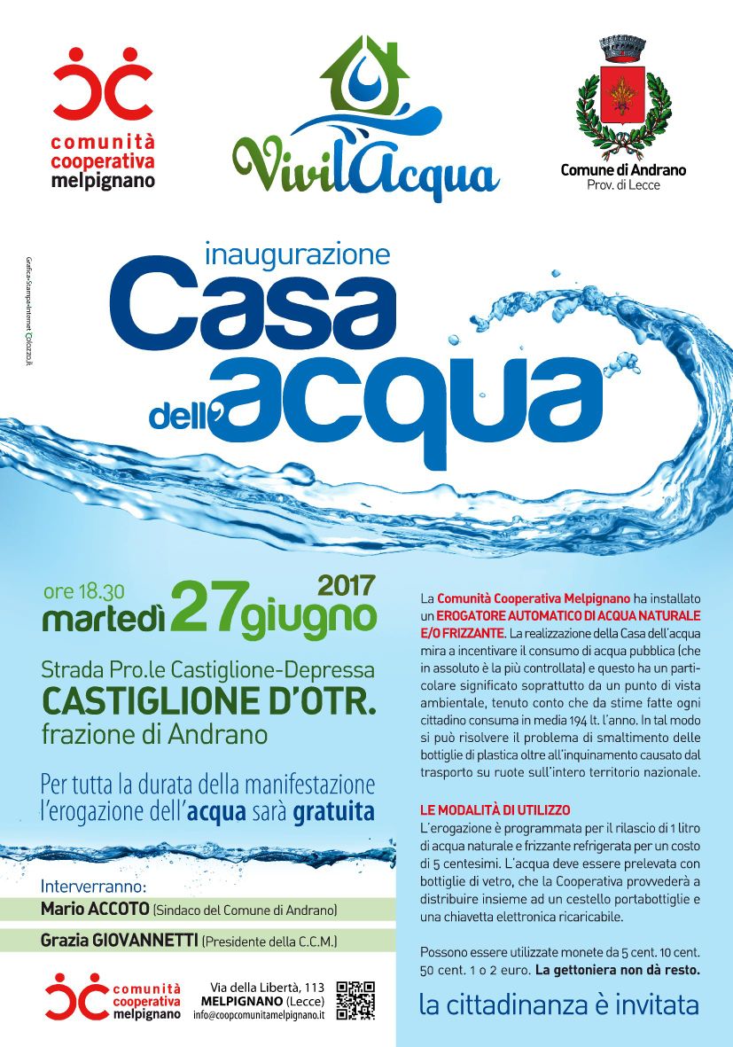 MartedÌ 27 Giugno 2017 ore 18,30 è prevista l'inaugurazione delle "CASA DELL'ACQUA" a Castiglione lungo la strada provinciale per Depressa. Zona Trice