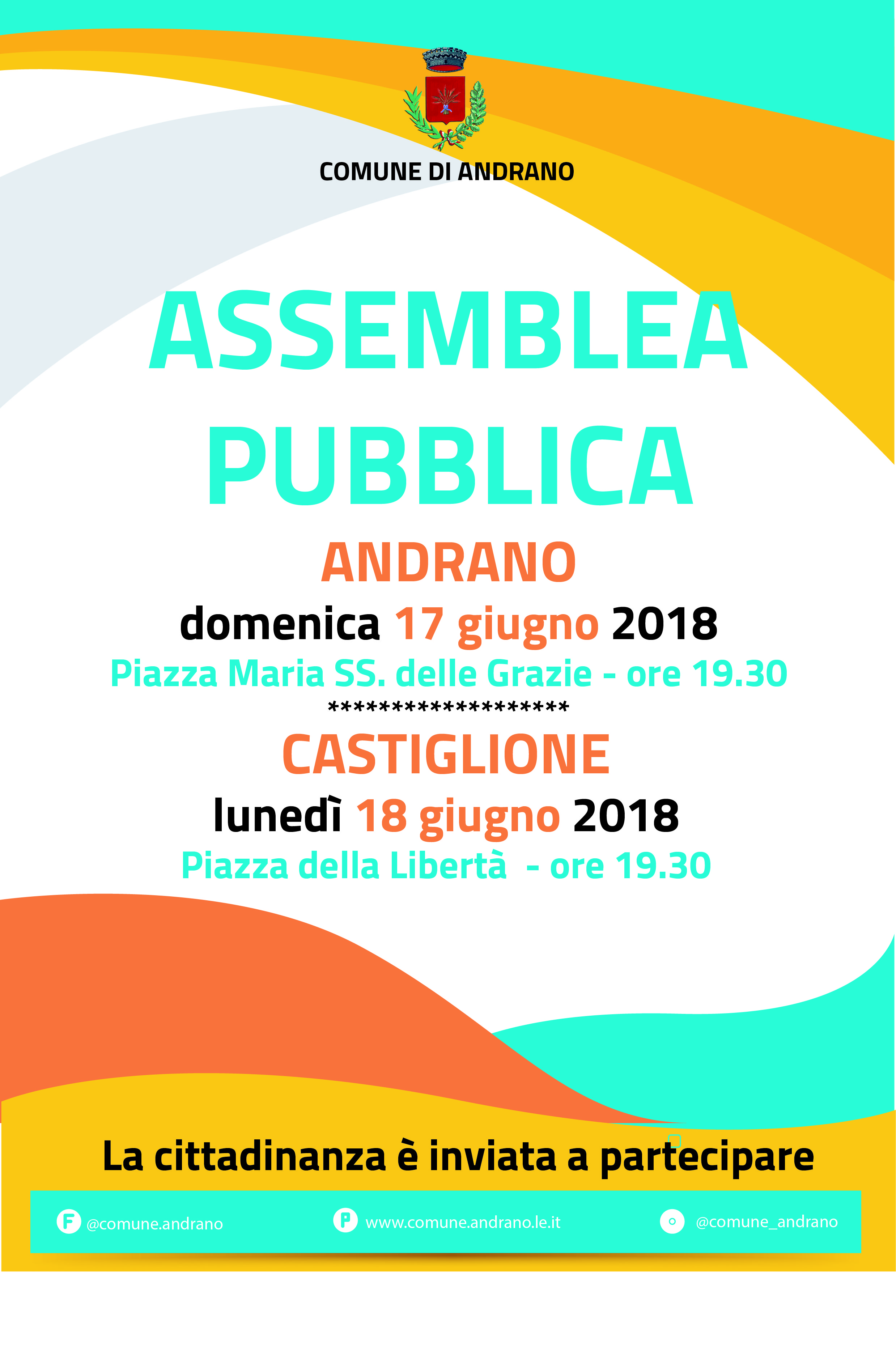 Ulteriori informazioni https://Pubbliche Assemblee di aggiornamento e rendiconto dell'attività amministrativa in: Andrano: domenica 17 giugno, ore 19.30, Piazza Maria SS. delle Grazie; Castiglione: luned&Igra
