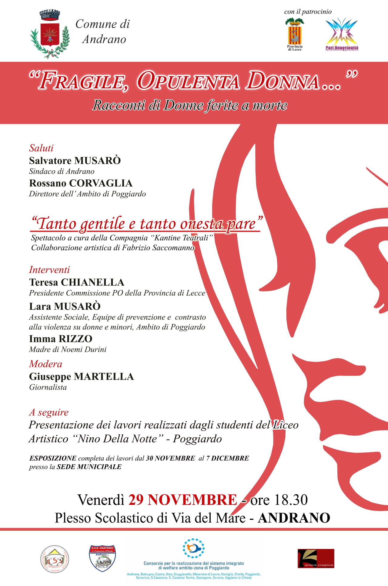 Gli studenti del Liceo Artistico Nino della Notte di Poggiardo esporranno dei lavori realizzati da loro. L'intera mostra sarà a disposizione per i visitatori presso la sede municipale dal 30 novembre al 7 dicembre"FRAGILE, OPULENTA DONNA.." RACCONTI DI DONNE FERITE A MORTE