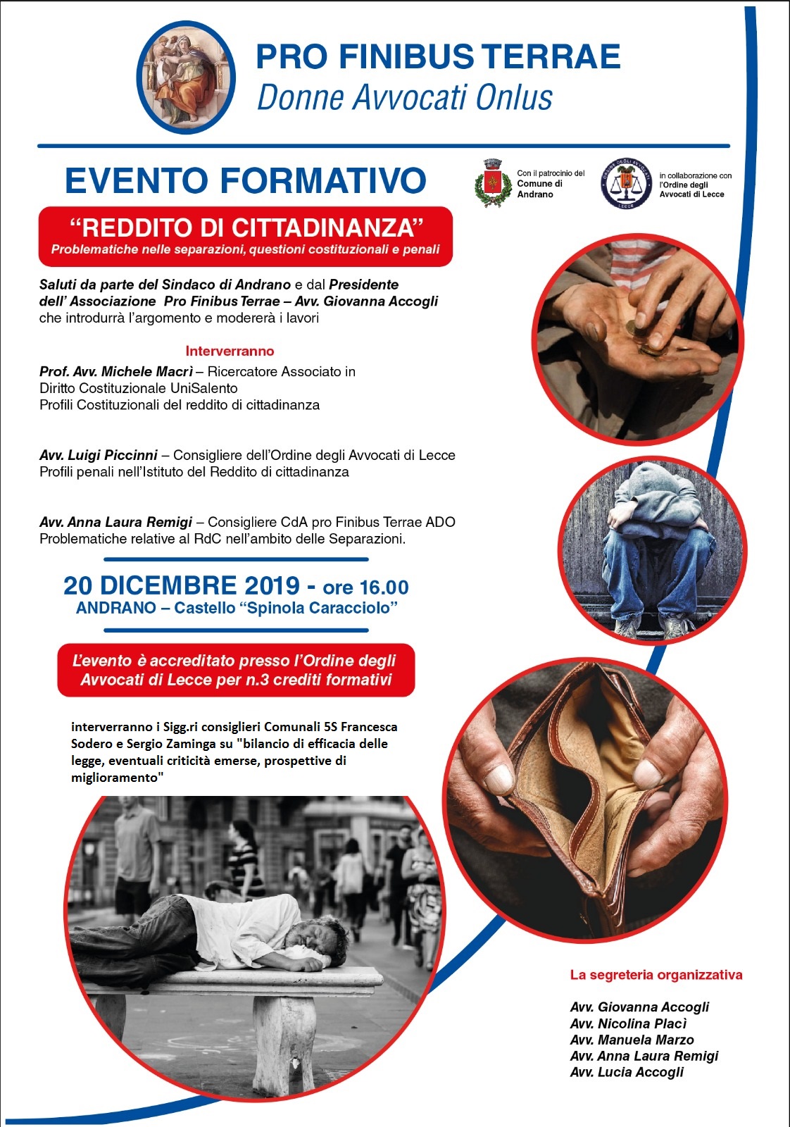 "Reddito di cittadinanza" - Problematiche nelle separazioni, questioni costituzionali e penali. VenerdÌ 20 dicembre, ore 16,00 - Castello di Andrano
