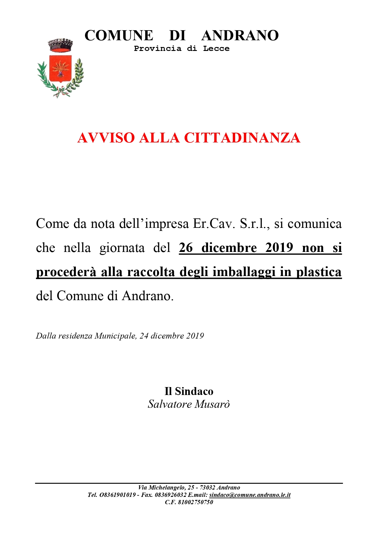 Causa chiusura dell'impianto Macero Sud s.a.s., per il giorno 26 dicembre 2019, non si procederà alla raccolta degli imballaggi in plastica del Comune di Andrano.