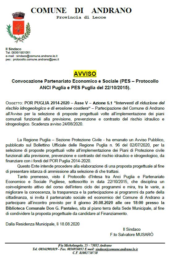 AVVISO Convocazione Partenariato Economico e Sociale (PES - Protocollo ANCI Puglia e PES Puglia del 22/10/2015) Biblioteca Comunale Don G. Pantaleo giovedÌ 20 agosto 2020 - ore 18:00