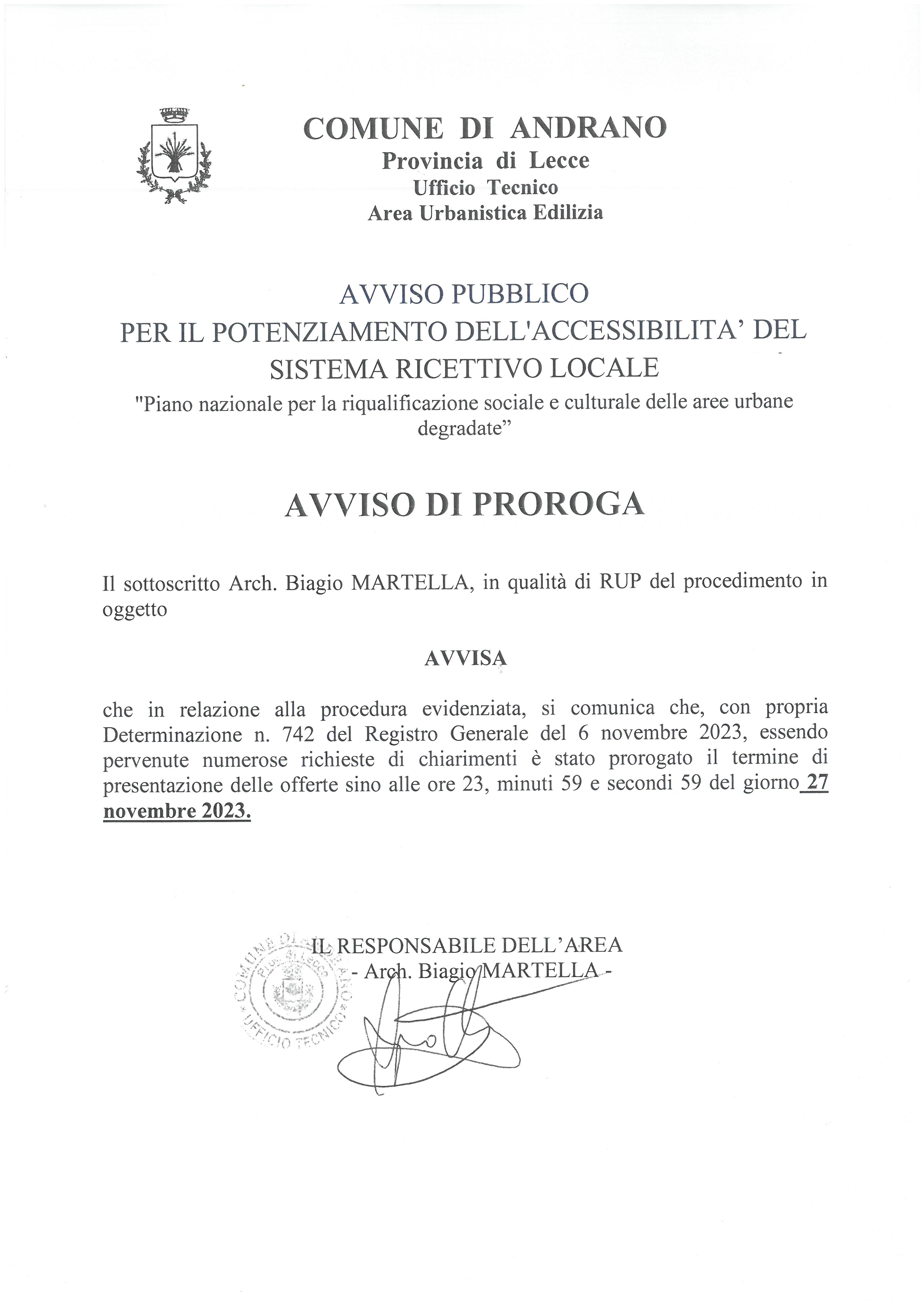 Il sottoscritto Arch. Biagio MARTELLA, in qualità di RUP del procedimento in oggetto, AVVISA che in relazione alla procedura evidenziata, si comunica che, con propria Determinazione n. 742 del Registro Generale del 6 novembre 2023, essendo pervenute numerose richieste di chiarimenti è stato prorogato il termine di presentazione delle offerte sino alle ore 23, minuti 59 e secondi 59 del giorno 27 novembre 2023.