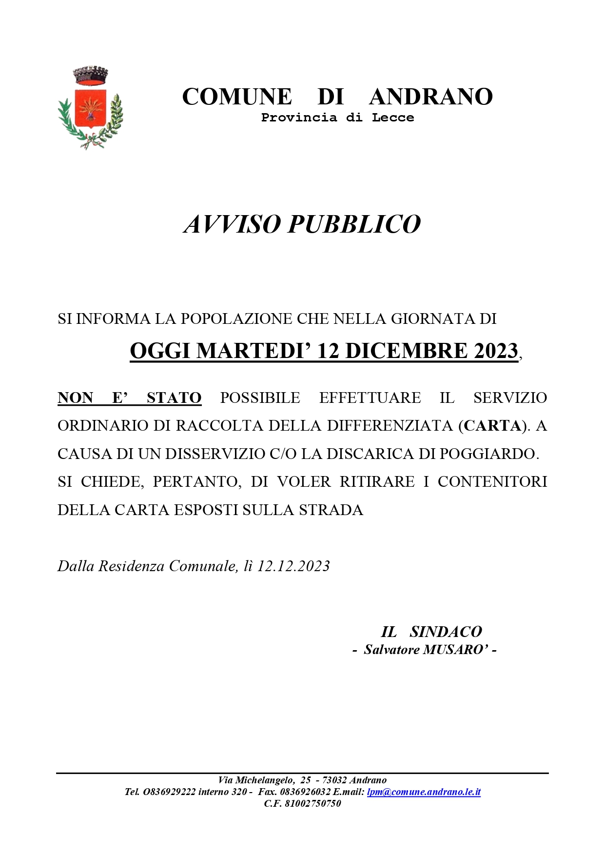 AVVISO: SI INFORMA LA POPOLAZIONE CHE NELLA GIORNATA DI OGGI MARTEDI' 12 DICEMBRE 2023, NON E' STATO POSSIBILE EFFETTUARE IL SERVIZIO ORDINARIO DI RACCOLTA DELLA DIFFERENZIATA (CARTA)