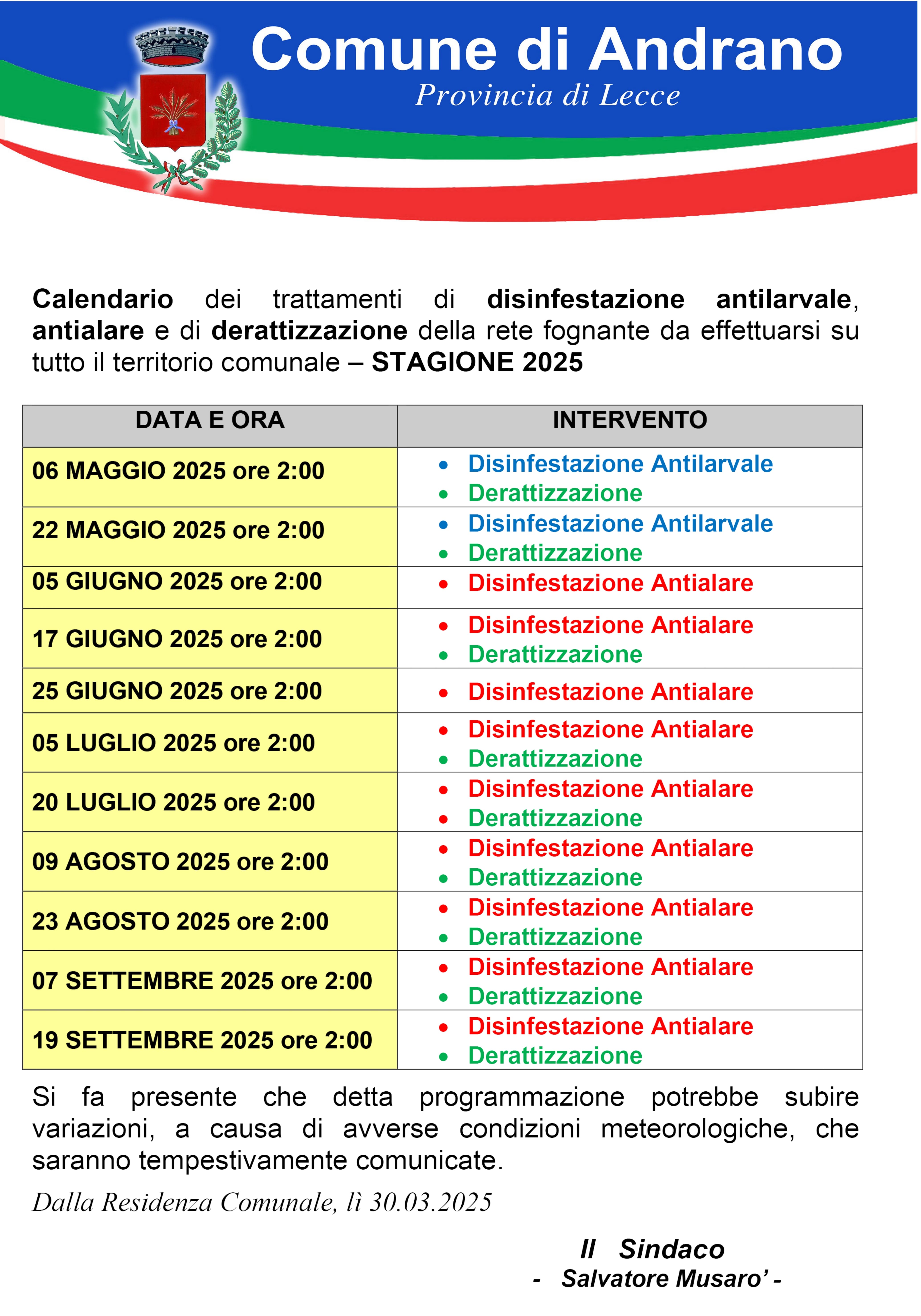 Informiamo la cittadinanza che saranno effettuati interventi di disinfestazione antilarvale, antialare e derattizzazione in Andrano, Castiglione e nella marina nelle giornate indicate in locandina.