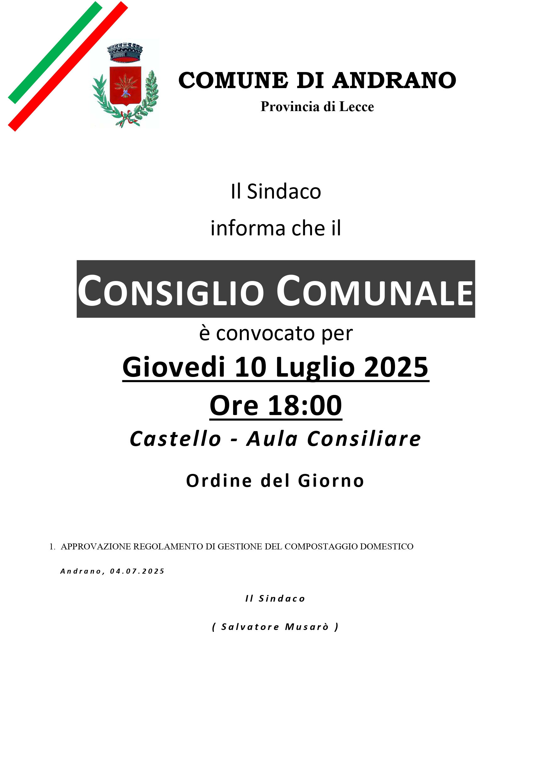 Il Sindaco informa che il CONSIGLIO COMUNALE è convocato per giovedì 10 luglio 2025 Ore 18:00 presso il Castello - Aula Consiliare.