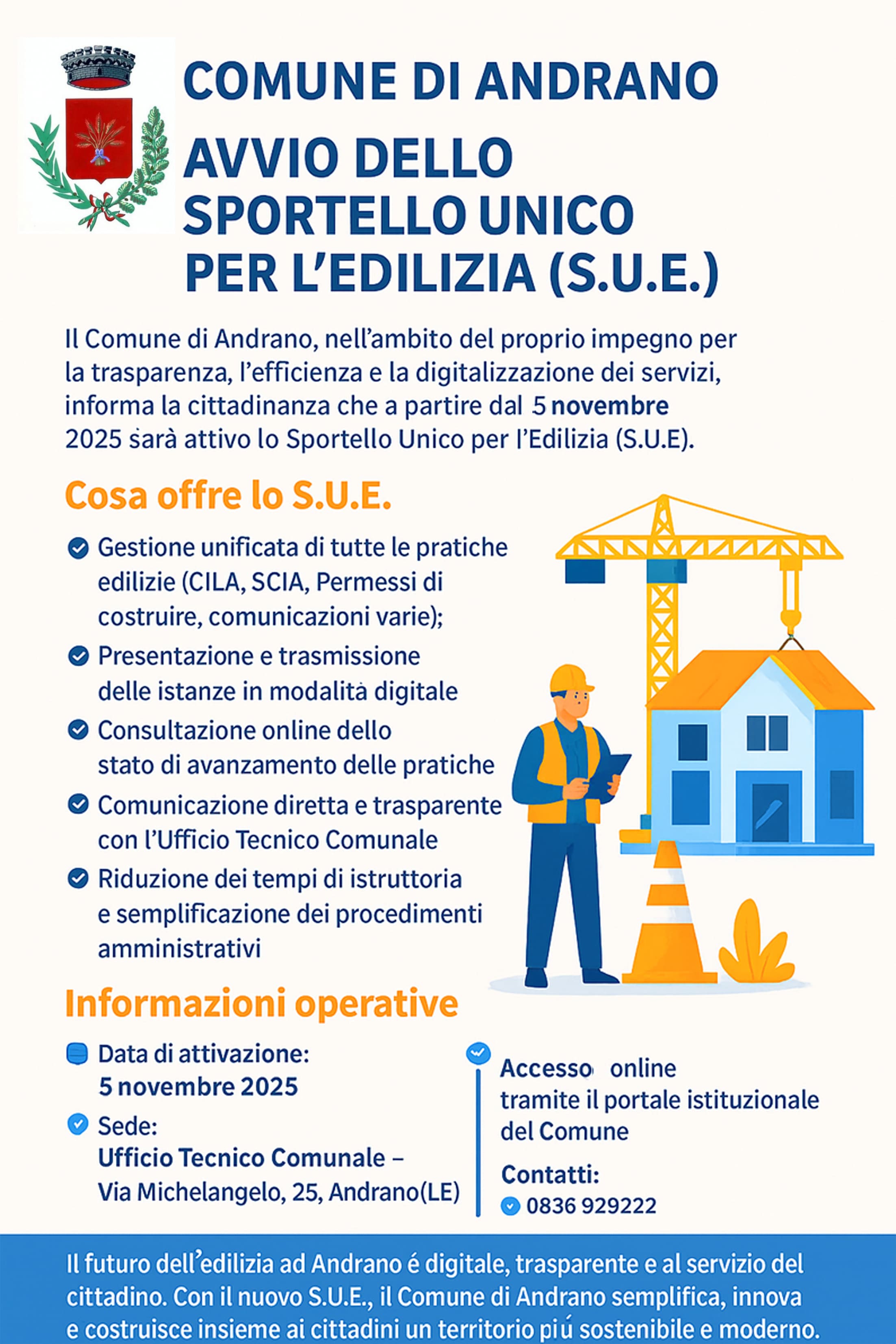 Dal 5 novembre 2025 sarà attivo lo sportello unico per l'edilizia (S.U.E.). L'accesso sarà effettuabile cliccando sull'apposita funzione mostrata in Home Page utilizzando i sistemi di autenticazione SPID o CIE.