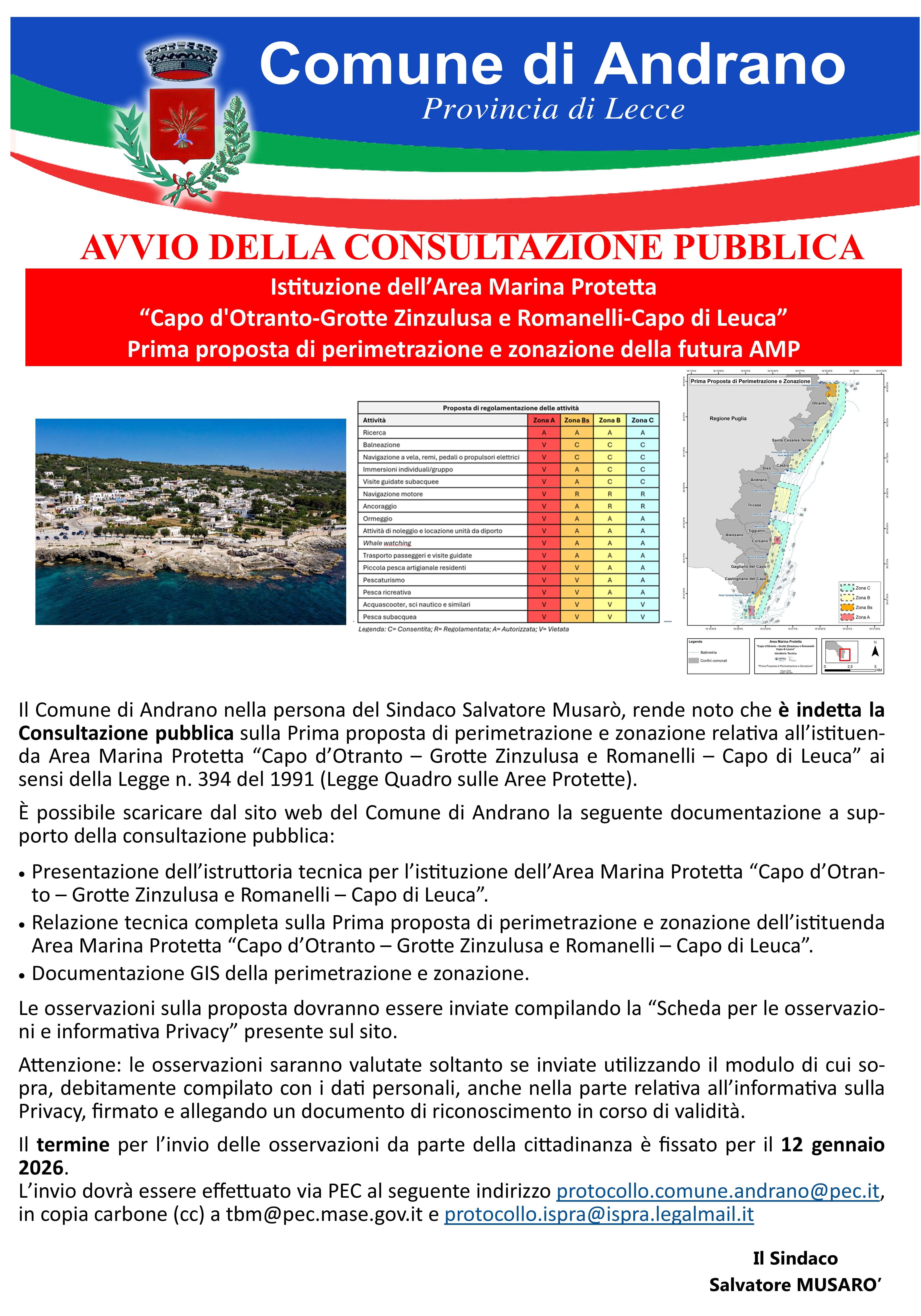 Il Comune di Andrano, nella persona del Sindaco Salvatore Musarò, rende noto che in data odierna viene indetta la Consultazione pubblica sulla Prima proposta di perimetrazione e zonazione relativa all’istituenda Area Marina Protetta “Capo d’Otranto – Grotte Zinzulusa e Romanelli – Capo di Leuca” ai sensi della Legge n. 394 del 1991 (Legge Quadro sulle Aree Protette).