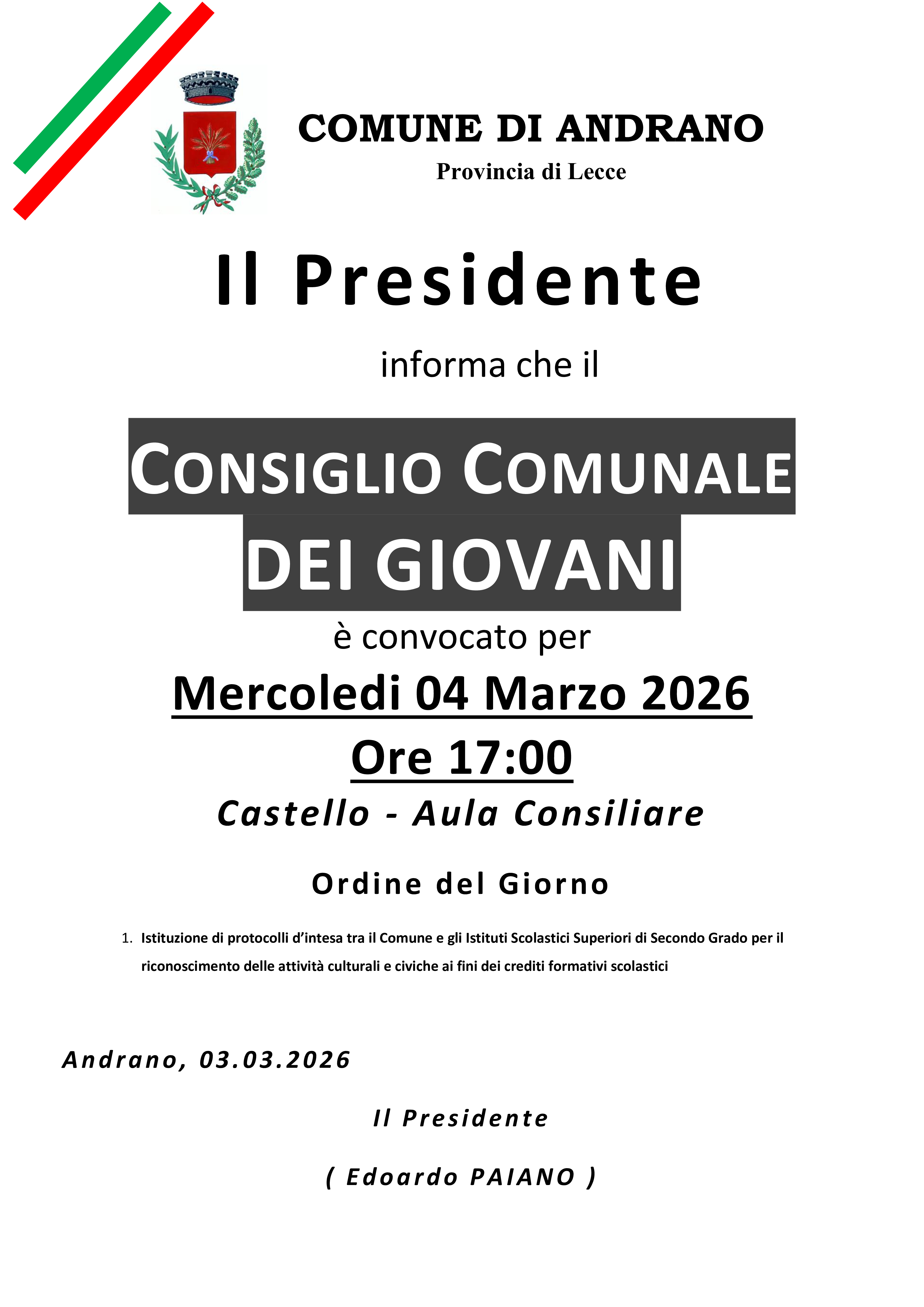 Il Presidente del Consiglio Comunale dei Giovani informa che il Consiglio è convocato per mercoledì 4 Marzo Ore 17:00 presso il Castello - Aula Consiliare