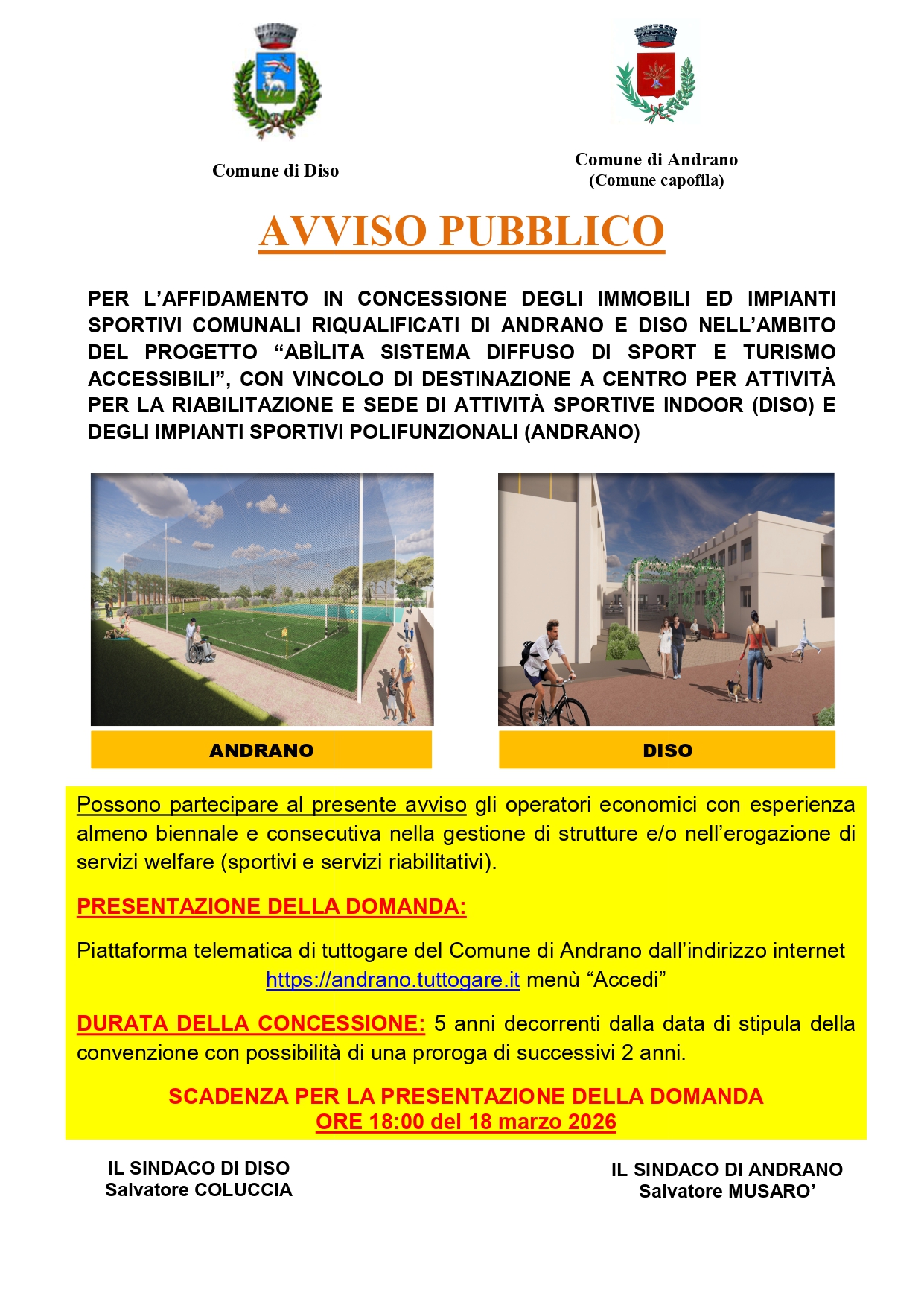Pubblicato il bando per l’affidamento in concessione per 5 anni degli immobili e degli impianti sportivi comunali di Andrano e Diso nell’ambito del progetto “Abìlita sistema diffuso di sport e turismo accessibili”, con vincolo di destinazione a centro per attività per riabilitazione e sede di attività sportive indoor (Diso) e degli impianti sportivi polifunzionali (Andrano).