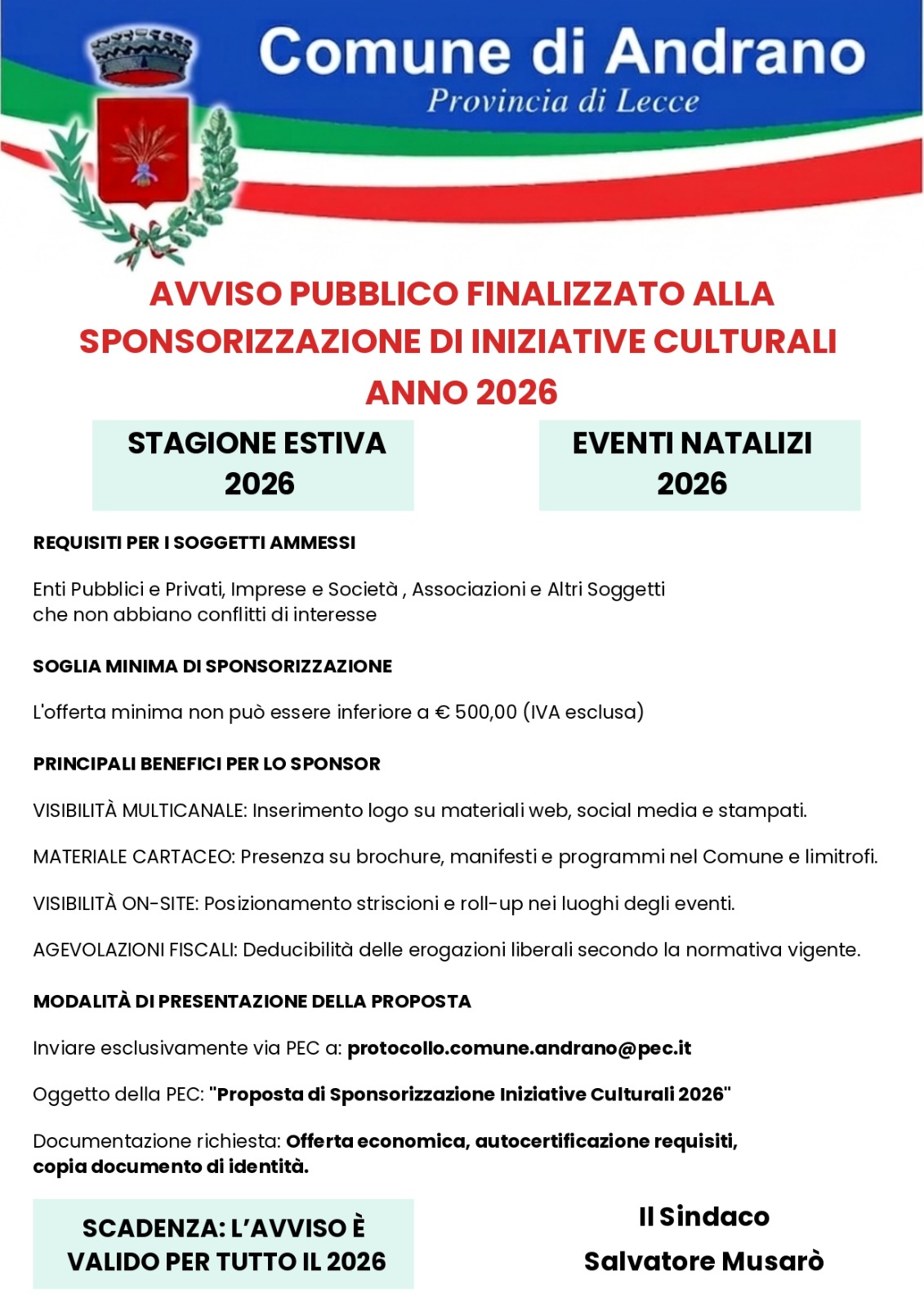 Con il presente Avviso Pubblico il comune di Andrano intende procedere alla ricerca di sponsorizzazioni per l’organizzazione degli eventi relativi alla stagione estiva 2026 e Natalizia 2026 che saranno resi pubblici non appena definiti.