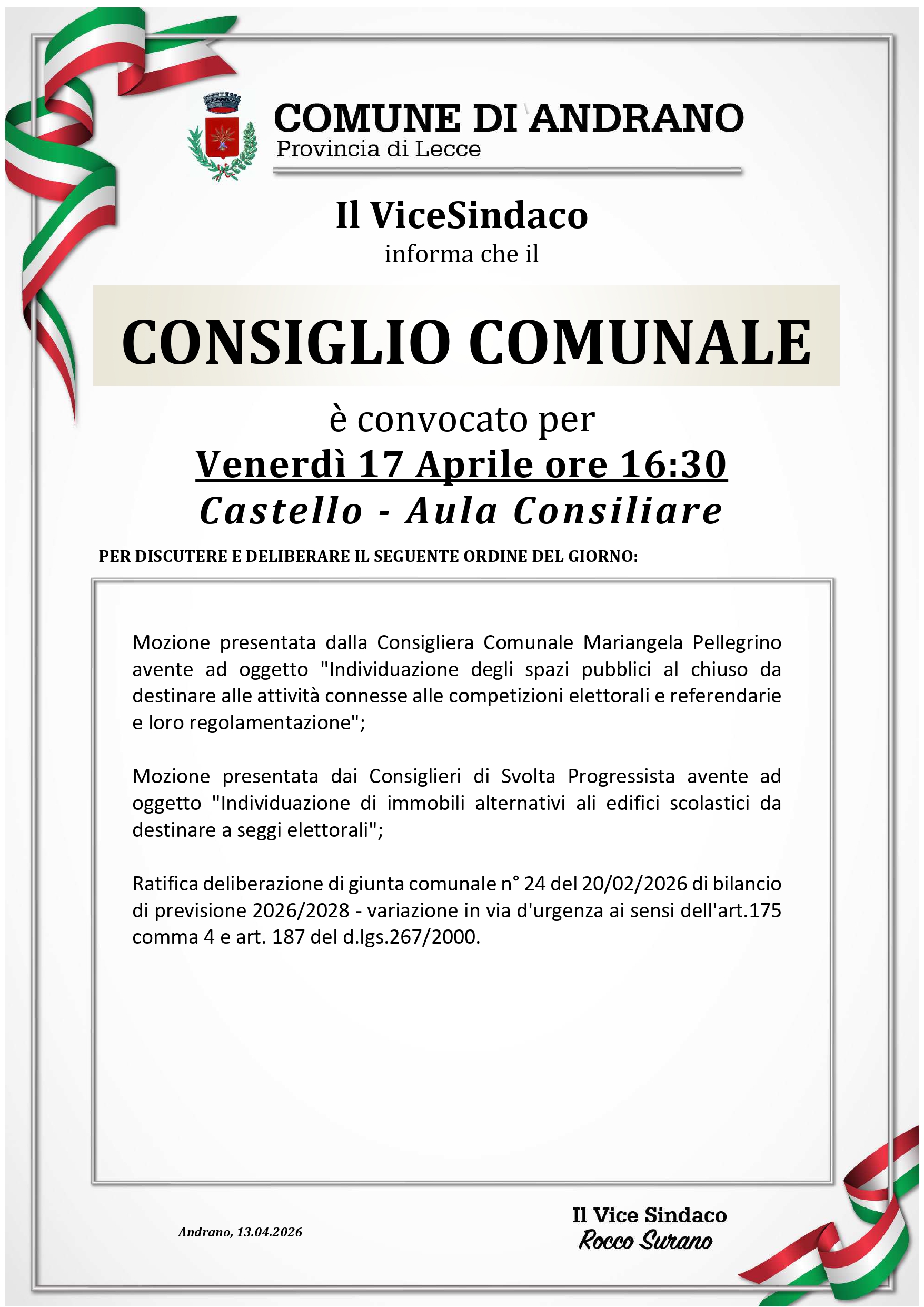 Convocazione Consiglio Comunale per il giorno 17 aprile 2026