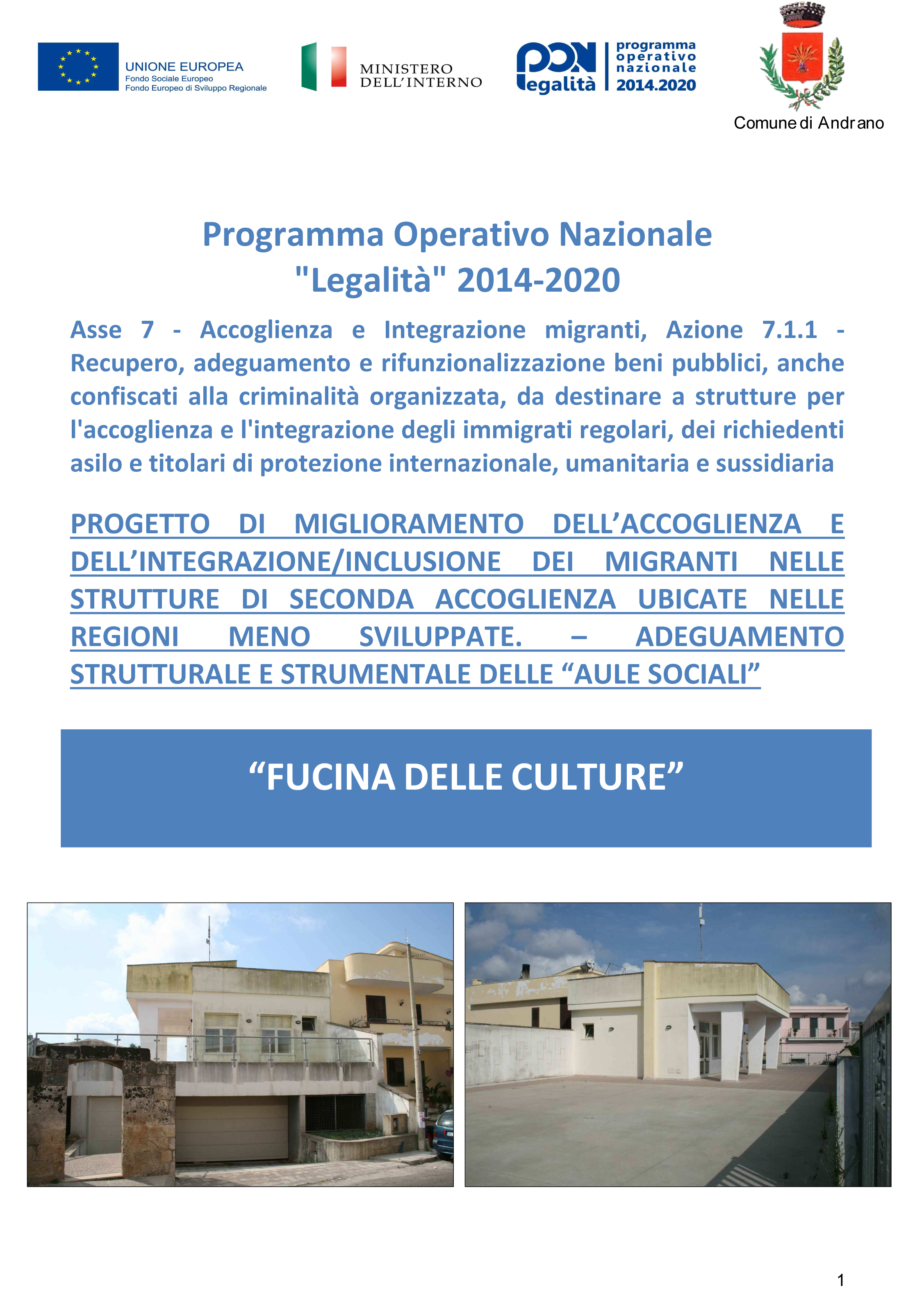 Grazie al P.O.N. Legalità 2014 - 2020 il Comune di Andrano ha ricevuto il finanziamento di ⬠263.960,60 per l'adeguamento strutturale e strumentale delle āAule Socialiā. Le finalità dell'intervento sono quelle di migliorare il processo di integrazione e inclusione degli immigrati regolari nel tessuto sociale, in modo sinergico e complementare ai progetti SPRAR attivati in questo Comune. Le āAule Socialiā diventeranno cosÌ luoghi di scambio artistico-culturale, di arricchimento reciproco, inclusione e aggregazione, centri polifunzionali per la formazione e l'inserimento lavorativo.