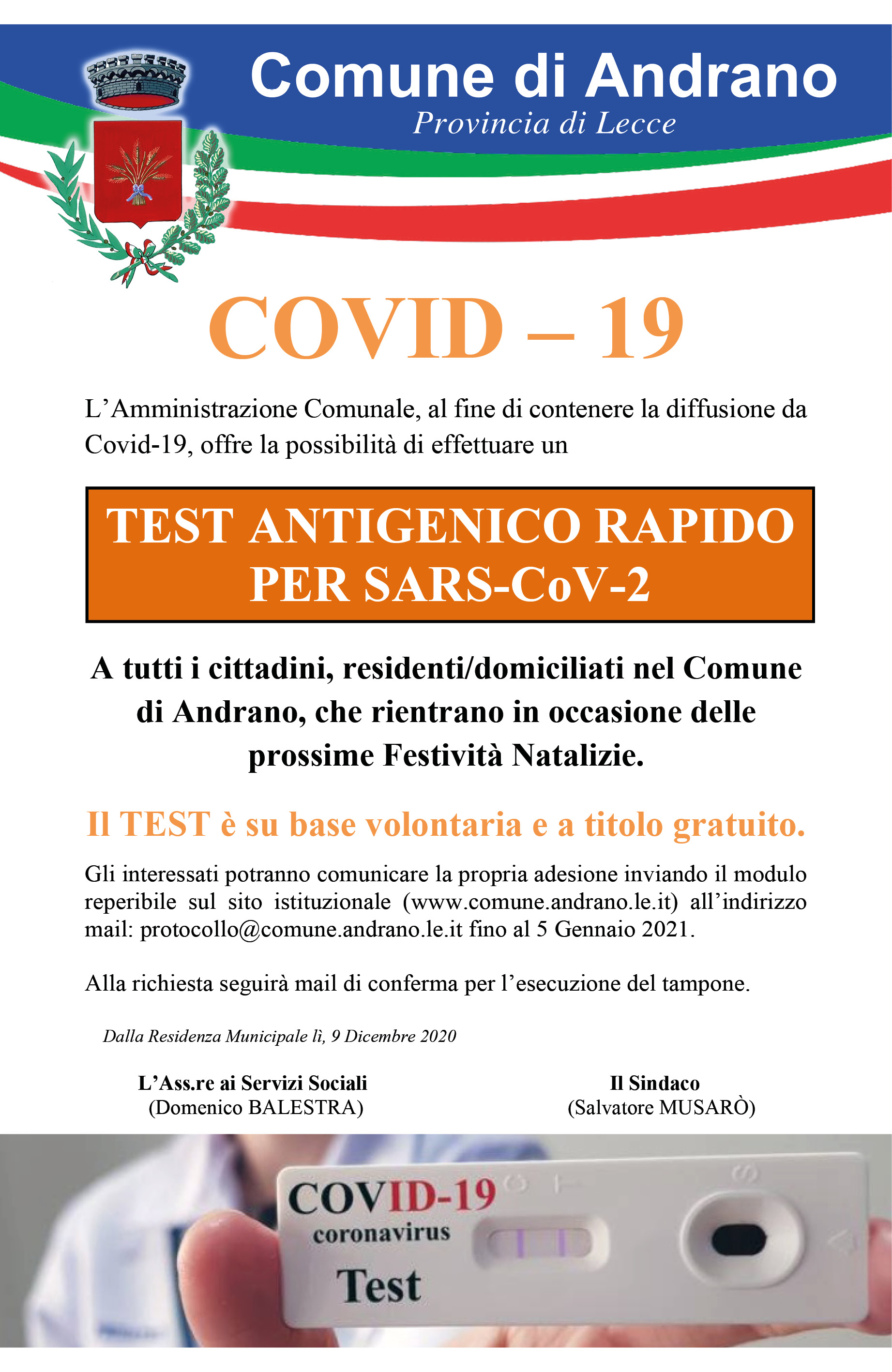 Per tutti i cittadini, residenti/domiciliati nel Comune di Andrano, che rientrano in occasione delle festività natalizie