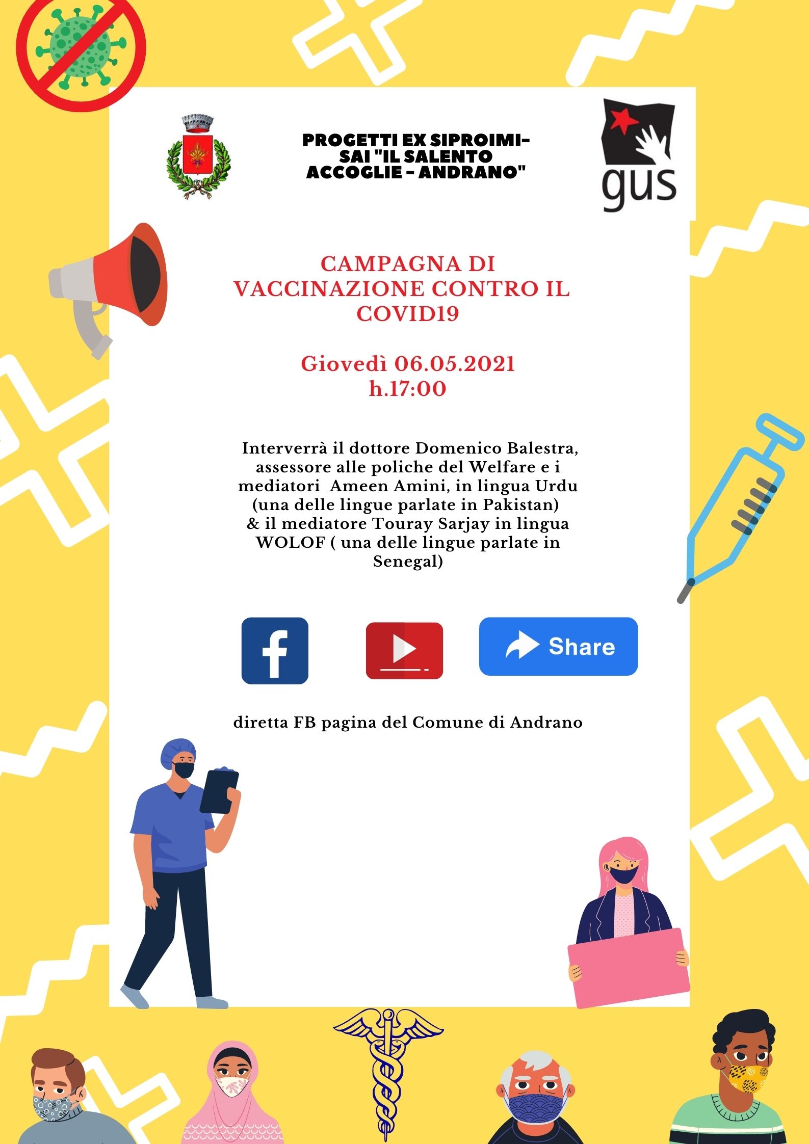 Terzo incontro di informazione sulla campagna di vaccinazione Anti Covid 19 in Urdu e Wolof organizzata dai progetti SAI "Il Salento Accoglie-Andrano Ord e Ds/DM" gestiti dal Gus-Gruppo Umana Solidarietà in collaborazione con il Comune di Andrano.