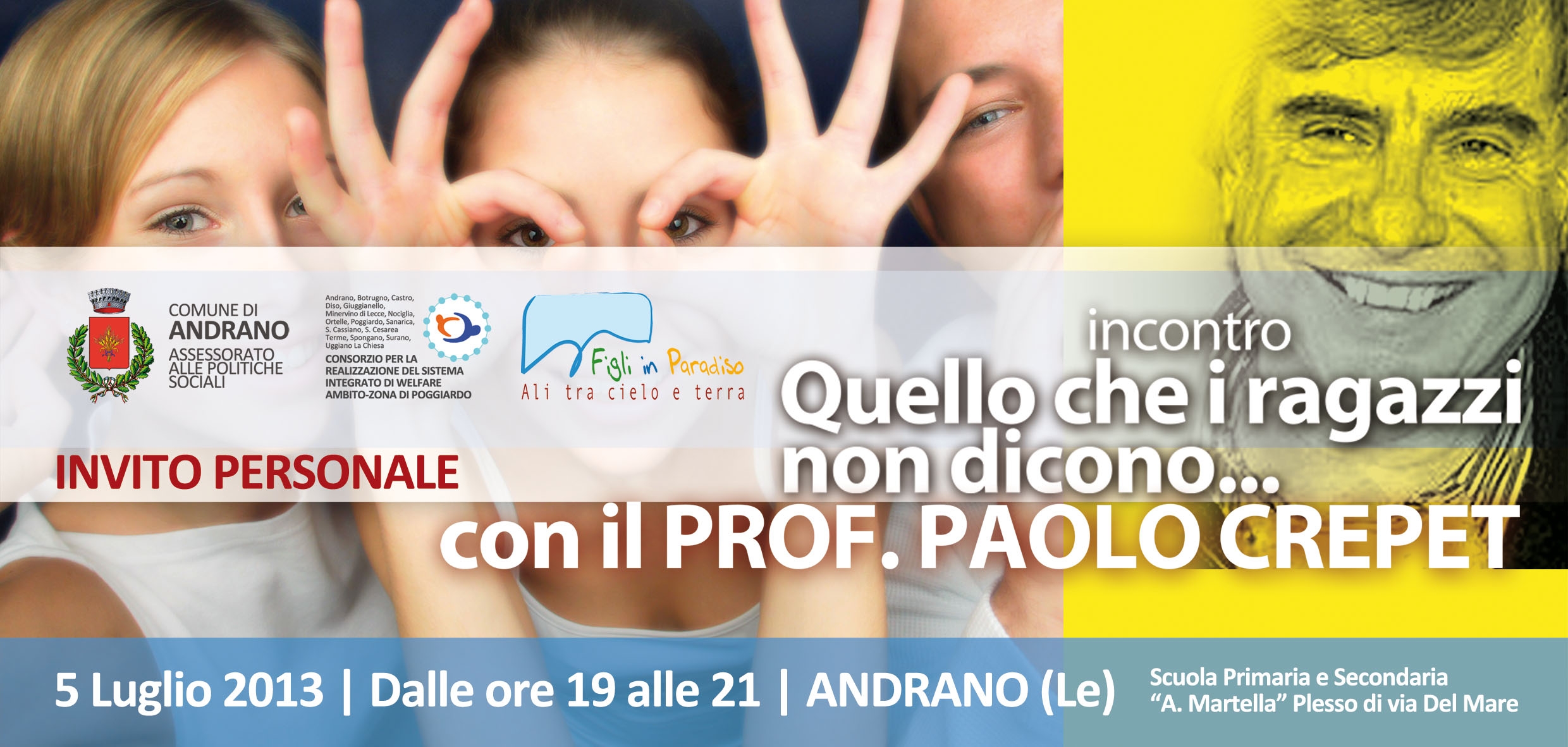 Il Comune di Andrano-Assessorato alle Politiche Sociali-, il Consorzio per la realizzazione del sistema integrato del Welfare Ambito di zona di Poggiardo e l'Associazione Figli in Paradiso ali tra cielo e terra; in data 5 luglio 2013 dalle 19.00 alle 21.00, presso la Scuola primaria e secondaria "A. Martella" Plesso di via del Mare - Andrano, vi invitano per un incontro con il Prof. Paolo Crepet dal titolo " Quello che i ragazzi non dicono............." "Quello che viviamo non è il frutto di errori di percorso o involuzioni impreviste, ma di una straordinaria mutazione antropologica, che coinvolge la famiglia, i giovani, le loro culture, l'intera comunità " Paolo Crepet