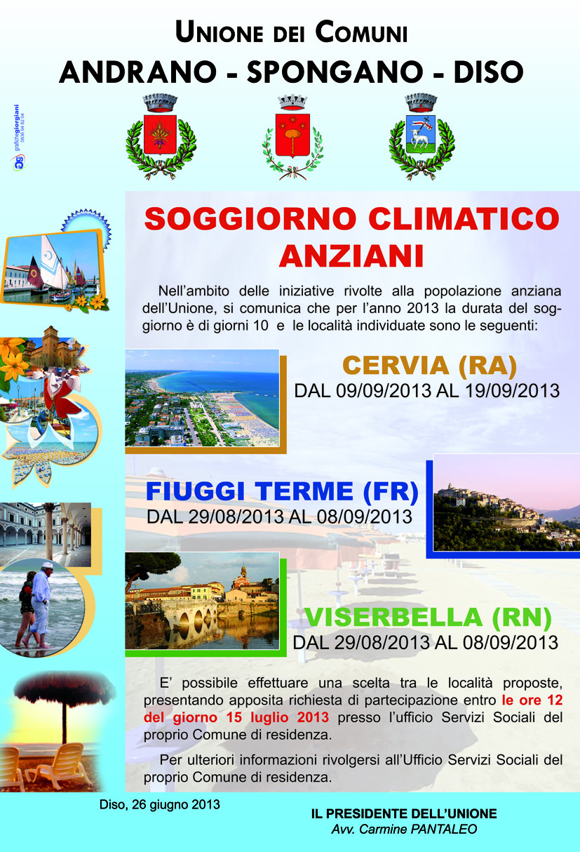 Nell'ambito delle iniziative rivolte alla popolazione anziana dell'Unione, si comunica che per l'anno 2013 la durata del soggiorno è di giorni 10 e le località individuate sono le seguenti: CERVIA - Provincia di Ravenna Dal 09/09/2013 al 19/09/2013 FIUGGI TERME DAL 29/08/2013 AL 08/09/2013 VISERBELLA - Provincia di Rimini DAL 29/08/2013 AL 08/09/2013 E' possibile effettuare una scelta tra le località proposte, presentando apposita richiesta di partecipazione entro le ore 12 del giorno 15 luglio 2013 presso l'ufficio Servizi Sociali del proprio Comune di residenza. Per ulteriori informazioni rivolgersi all'Ufficio Servizi Sociali del proprio Comune di residenza. IL PRESIDENTE Avv. Carmine PANTALEO