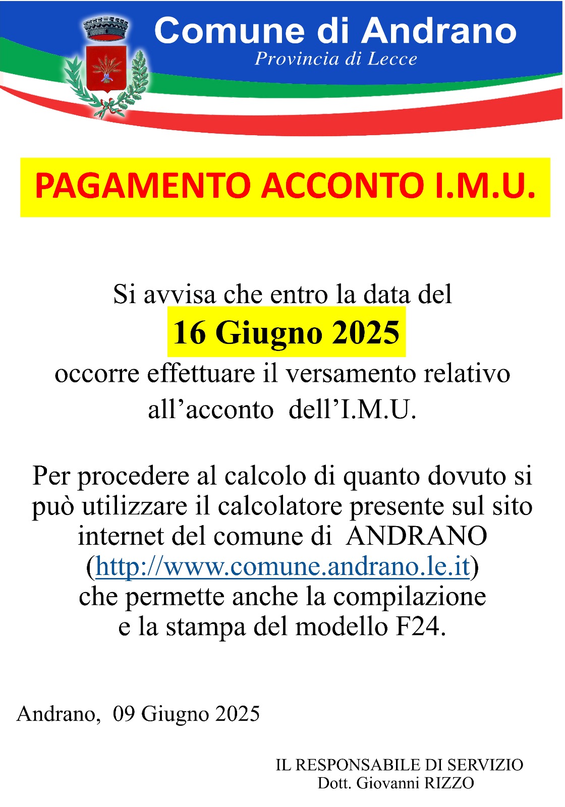 Si avvisa che entro la data del 16 Giugno 2025 occorre effettuare il versmento relativo all'acconto I.M.U.