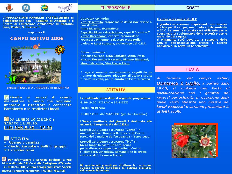 L'associazione Famiglie Castiglionesi in collaborazione con il Comune di Andrano e il Centro di Educazione Ambientale di Andrano, Diso, Castro e S. Cesarea T., organizza il CAMPO ESTIVO 2006 presso il Lascito Carrozzo.
