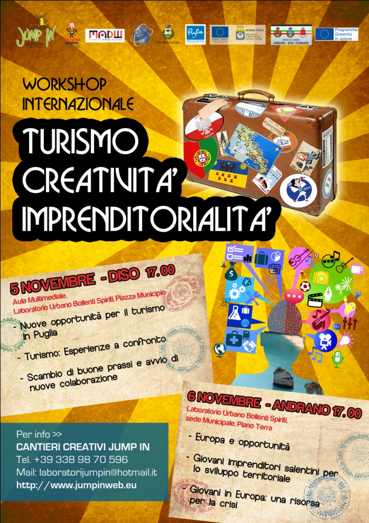 Operatori del settore turismo, giovani imprenditori, giornalisti, blogger ed opinion leader si incontreranno per discutere con le istituzioni locali e la cittadinanza sulle tematiche "Turismo, Creatività , Imprenditorialità " favorendo lo scambio di buone prassi internazionali.