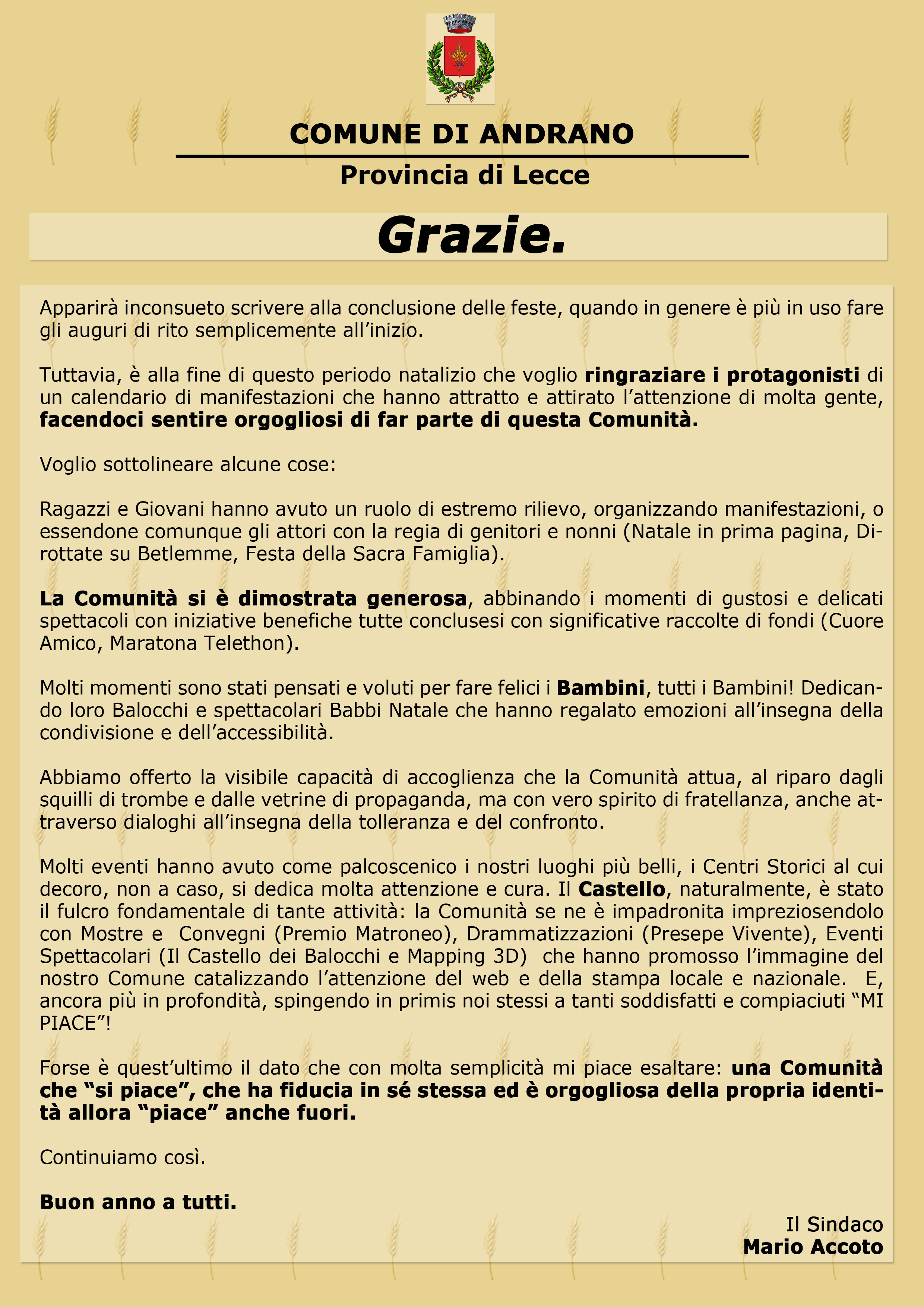 Tuttavia, è alla fine di questo periodo natalizio che voglio di ringraziare i protagonisti di un calendario di manifestazioni che hanno attratto e attirato l'attenzione di molta gente, facendoci sentire orgogliosi di far parte di questa Comunità . Voglio sottolineare alcune cose: