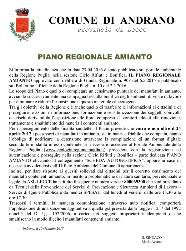 Entro e non oltre il 24 Aprile 2017 i possessori di manufatti in amianto dovranno notificare la detenzione di tale materiale sul portale della regione Puglia www.ecologia.regione.puglia.it
