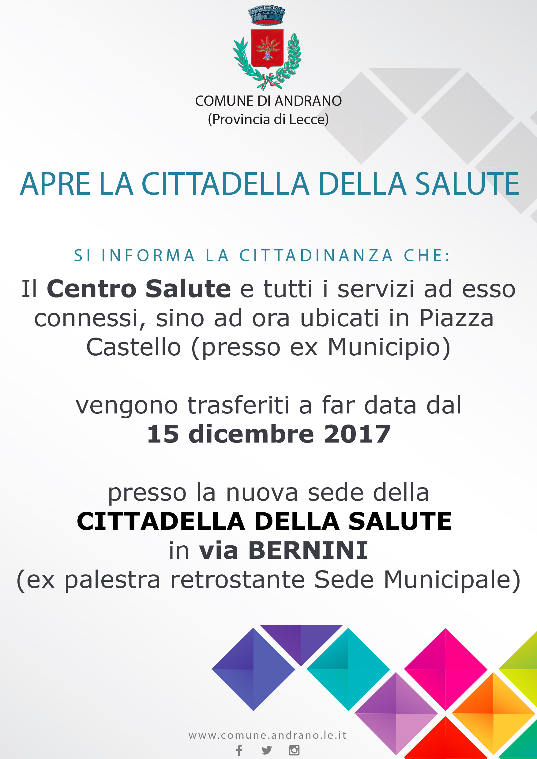 A partire dal 15 dicembre 2017, comincia una nuova vita per la Comunità di Andrano e Castiglione: è attiva la CITTADELLA DELLA SALUTE, nei locali accanto la sede Municipale (via Bernini, presso ex Palestra)