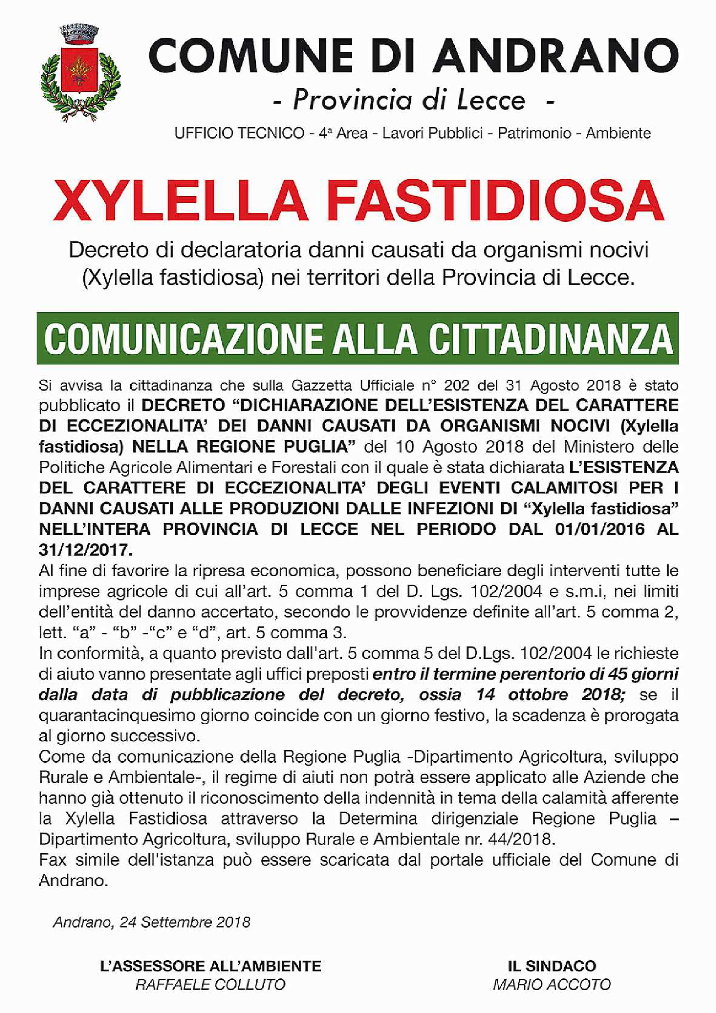 XYLELLA FASTIDIOSA Decreto di declaratoria danni causati da organismi nocivi (Xylella Fastidiosa) nei territori della Provincia di Lecce.