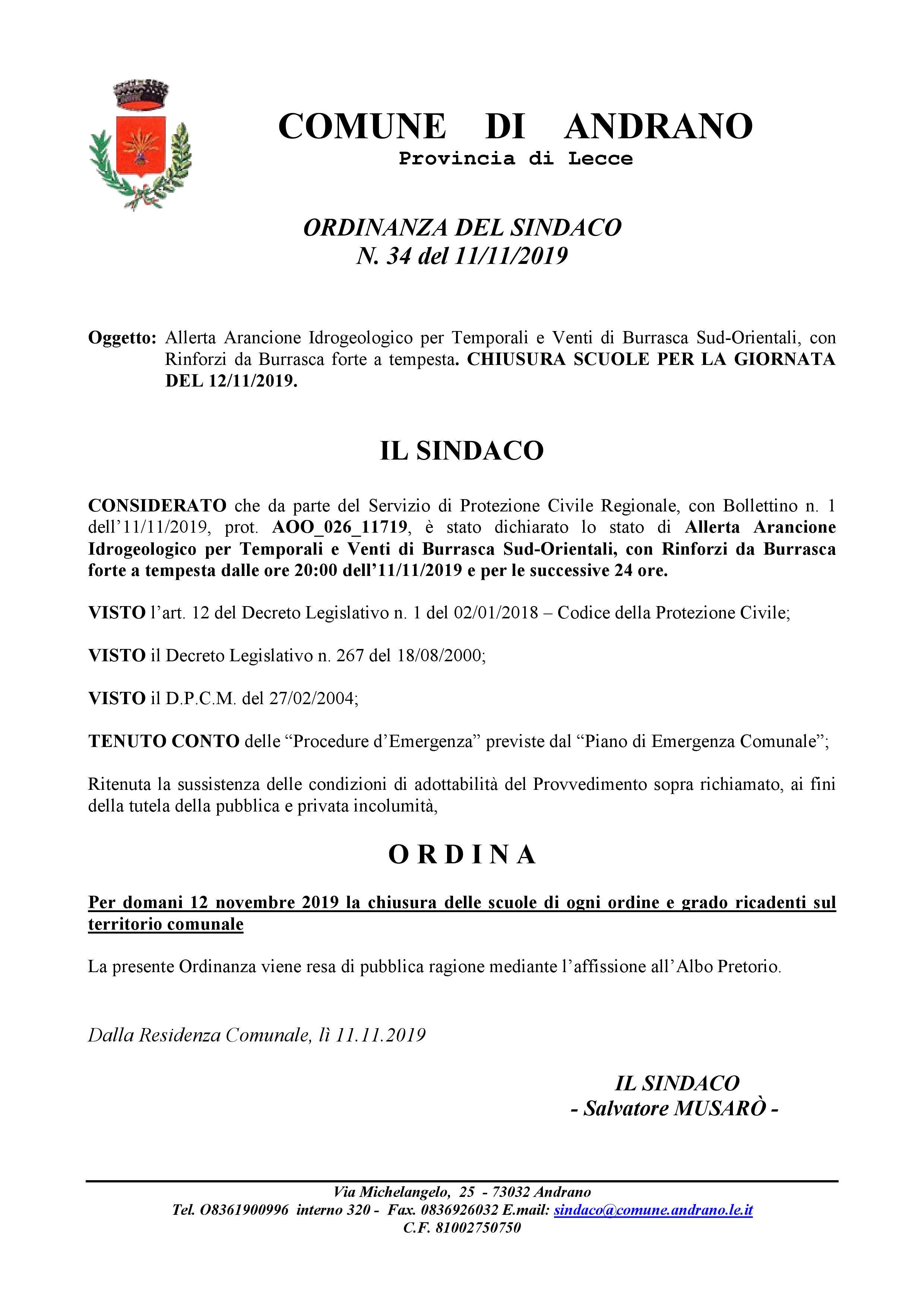 ORDINANZA DEL SINDACO N. 34/2019 -CHISURA DELLE SCUOLE PER LA GIORNATA DEL 12/11/2019