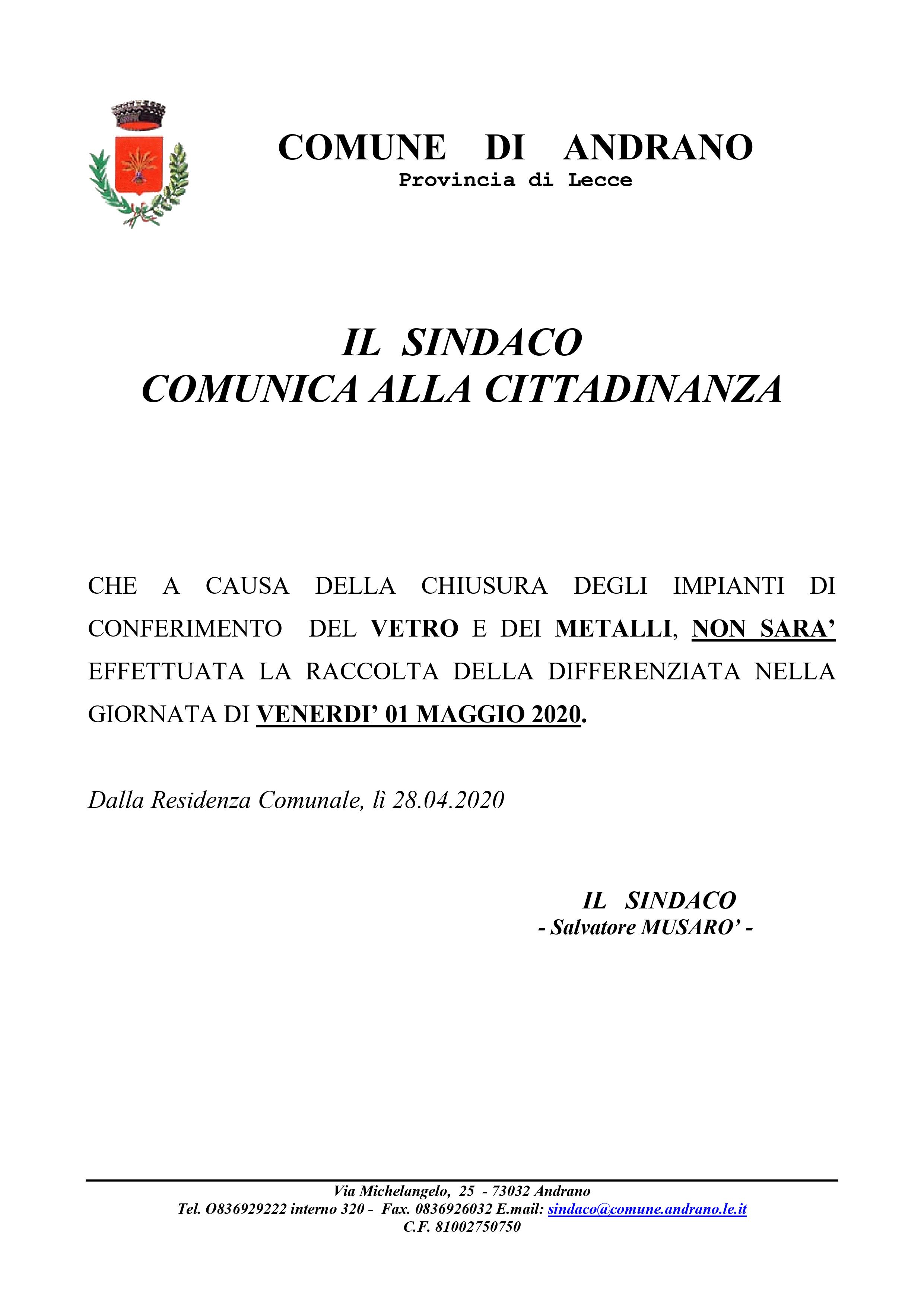 COMUNICAZIONE DEL SINDACO: NON SARA' EFFETTUATA LA RACCOLTA DEL VETRO E DEI METALLI NELLA GIORNATA DI VENERDI' 01 MAGGIO 2020