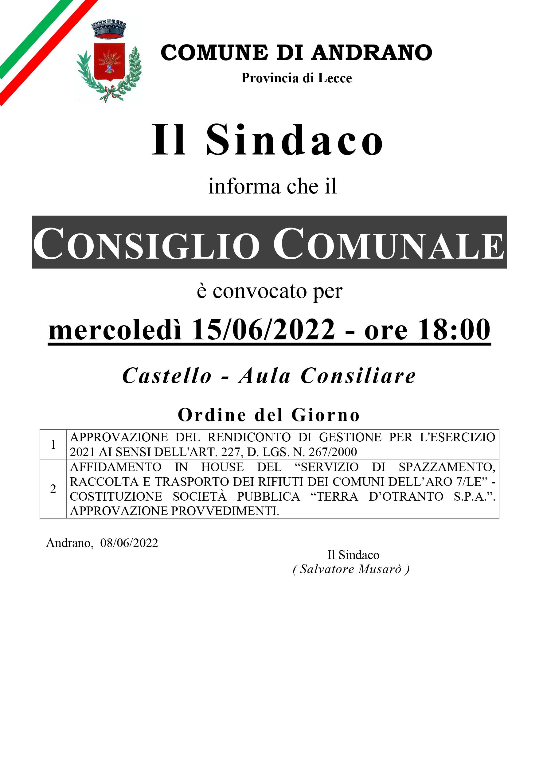 2) Proposta di deliberazione ad oggetto: AFFIDAMENTO IN HOUSE DEL "SERVIZIO DI SPAZZAMENTO, RACCOLTA E TRASPORTO DEI RIFIUTI DEI COMUNI DELL'ARO 7/LE" - COSTITUZIONE SOCIETÀ PUBBLICA "TERRA D'OTRANTO S.P.A.". APPROVAZIONE PROVVEDIMENTI.