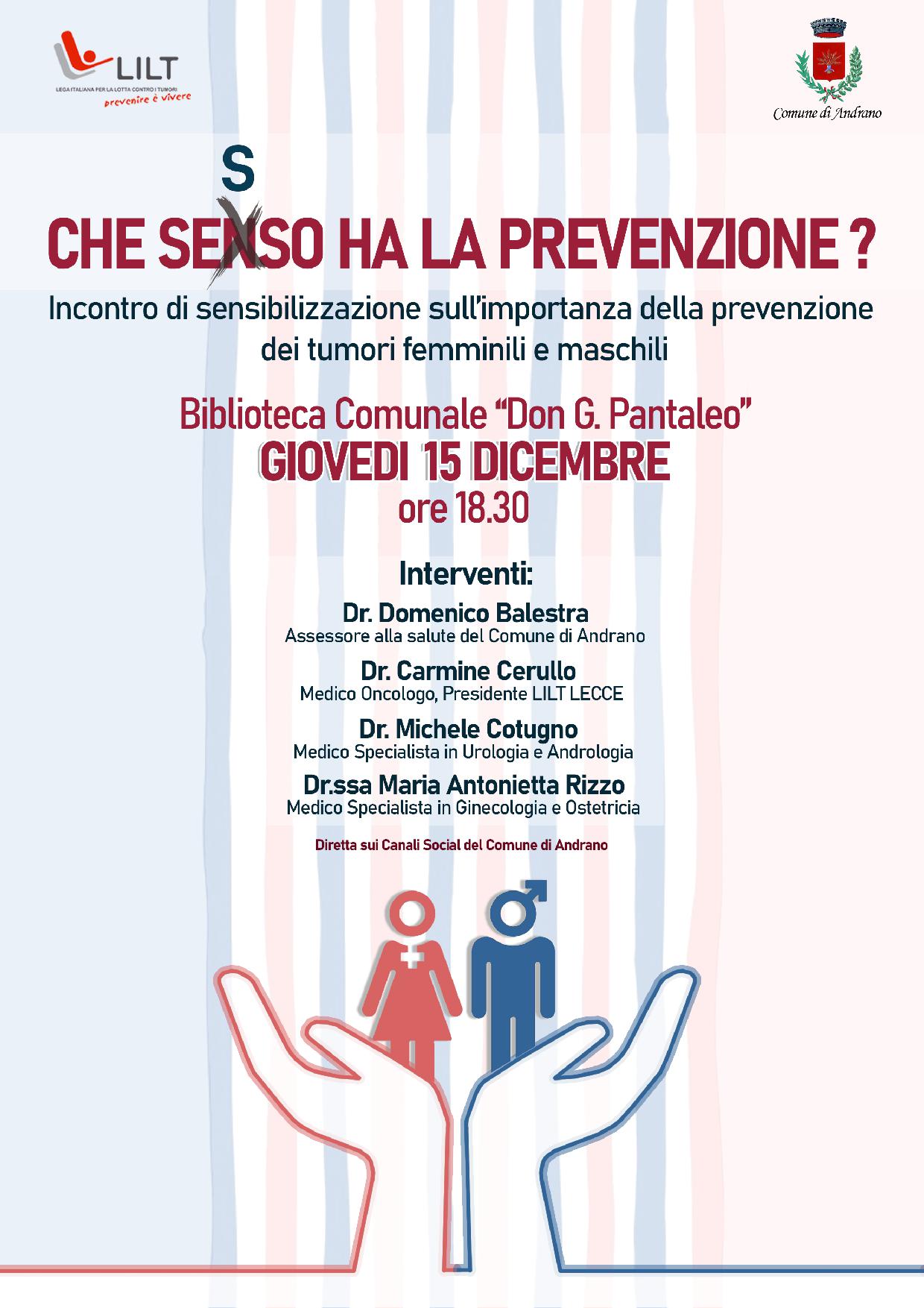 Incontro di sensibilizzazione sull'importanza della prevenzione dei tumori femminili e maschili - Giovedi' 15 Dicembre, ore 18,30 - Biblioteca Comunale Don Giacomo Pantaleo