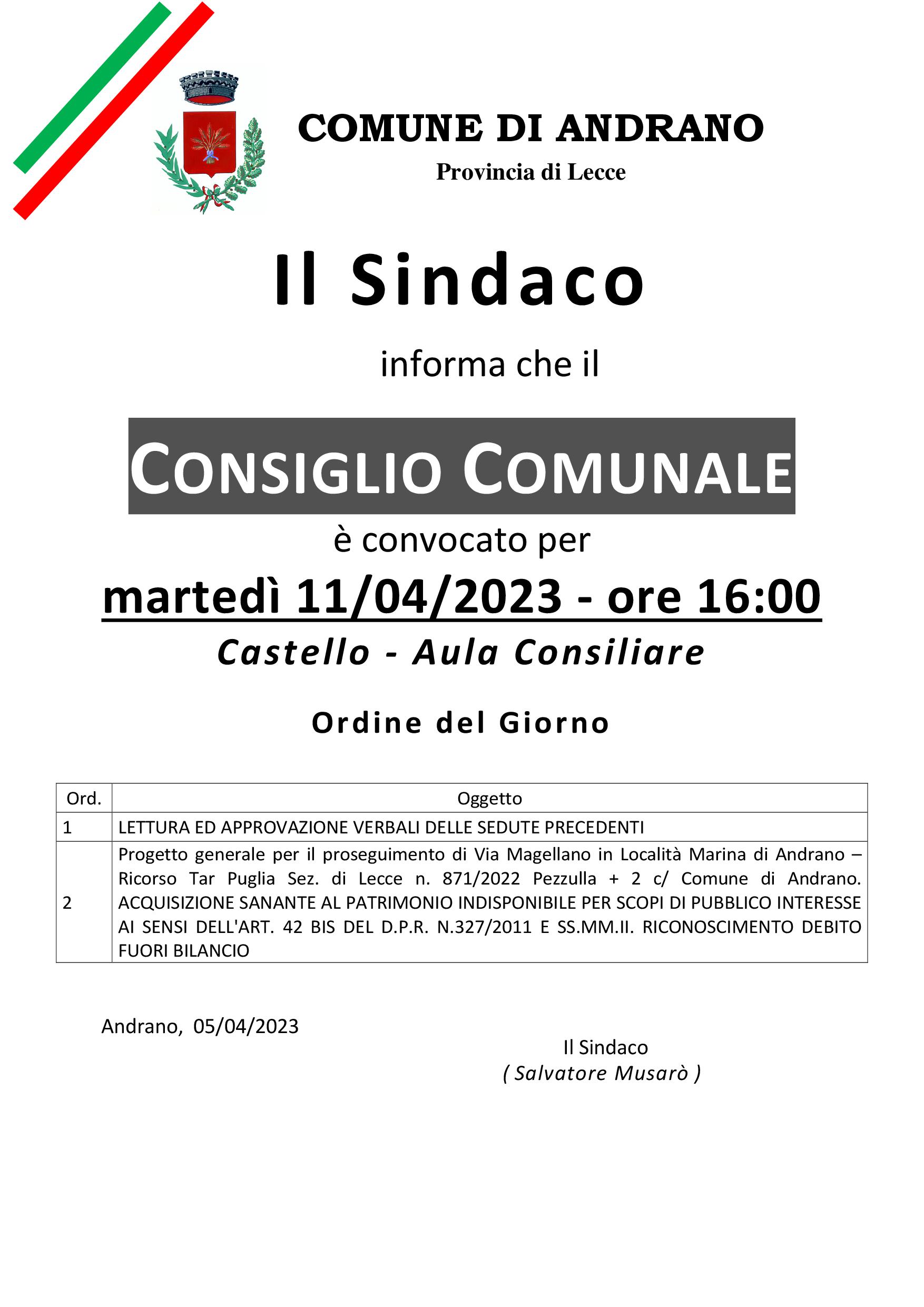 CONVOCAZIONE CONSIGLIO COMUNALE - MARTEDI' 11 APRILE - ORE 16:00