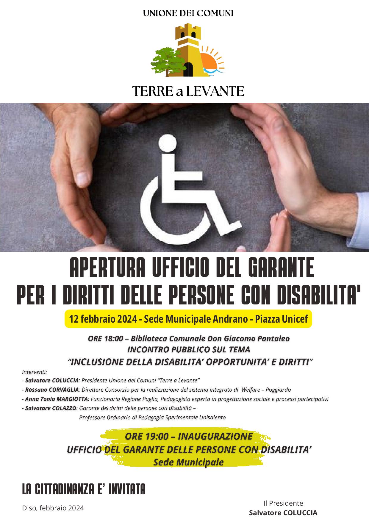 APERTURA UFFICIO DEL GARANTE PER I DIRITTI DELLE PERSONE CON DISABILITA'