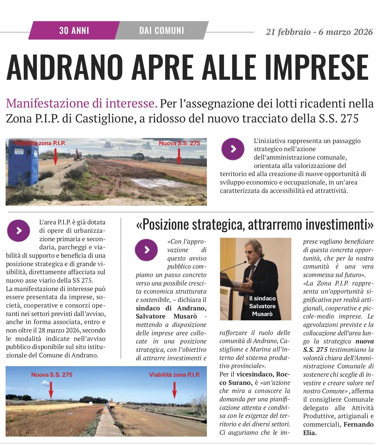 «Con l’approvazione di questo avviso pubblico compiamo un passo concreto verso una possibile crescita economica strutturata e sostenibile, – dichiara il sindaco di Andrano, Salvatore Musarò - mettendo a disposizione delle imprese aree collocate in una posizione strategica, con l’obiettivo di attrarre investimenti e rafforzare il ruolo delle comunità di Andrano, Castiglione e Marina all’interno del sistema produttivo provinciale».